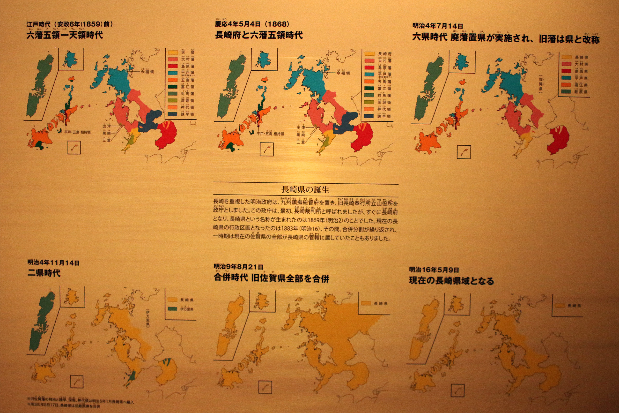 長崎を重視した明治政府は、九州鎮撫総督府を置き、旧長崎奉行所立山長所を政庁としました。この政庁は、最初、長崎裁判所と呼ばれましたが、すぐに長崎府となり、長崎県という名称が生まれたのは1869年(明治2)のことでした。現在の長崎県の行政区画となったのは1883年(明治16)、その間、合併分割が繰り返され、一時期は現在の佐賀県の全部が長崎の管に属していたこともありました。 (展示より引用)