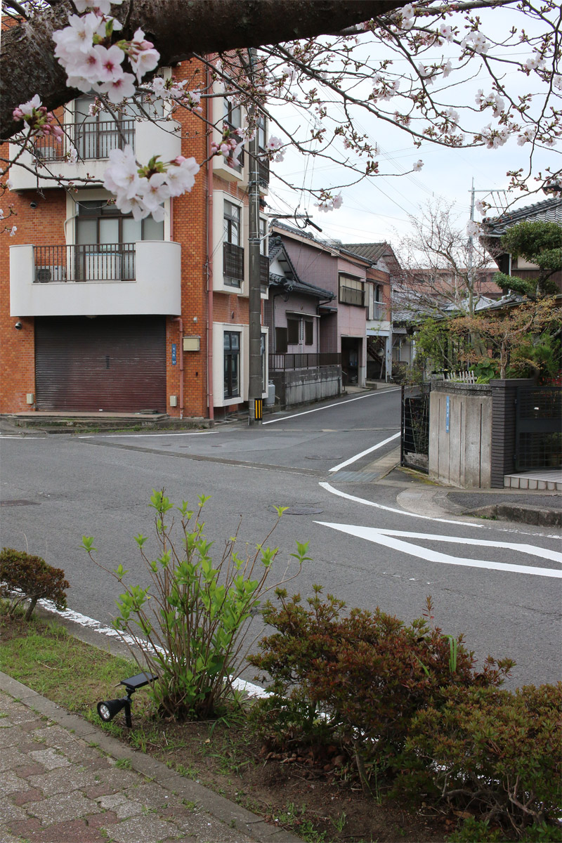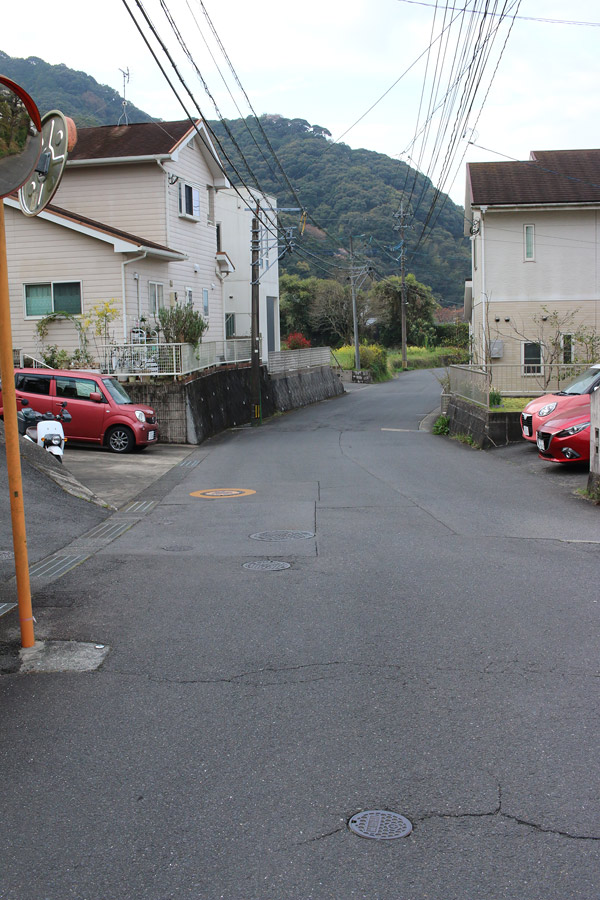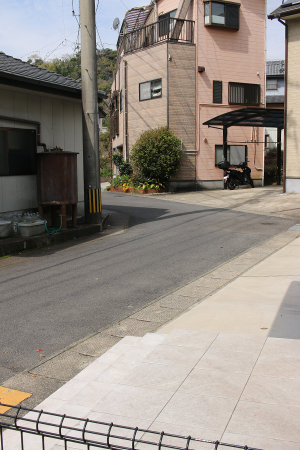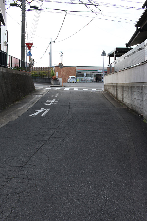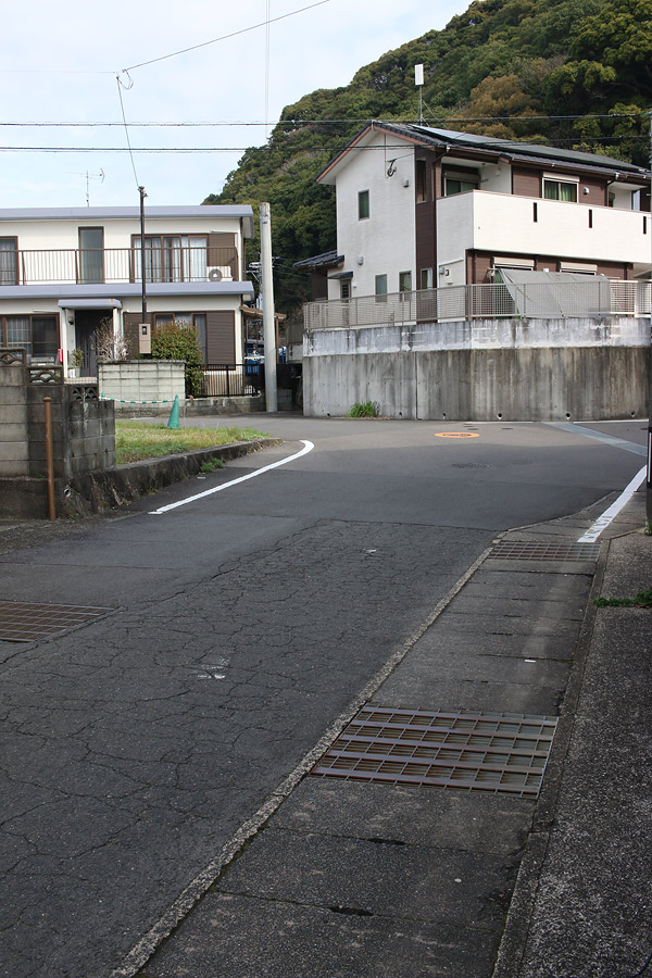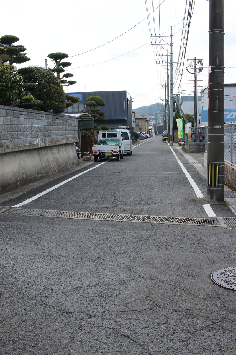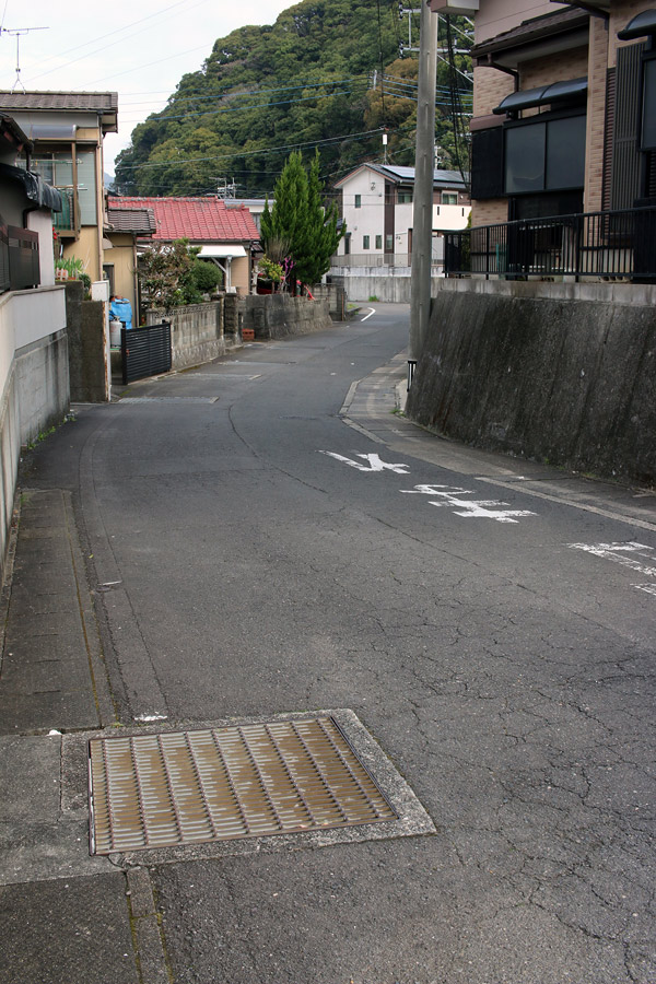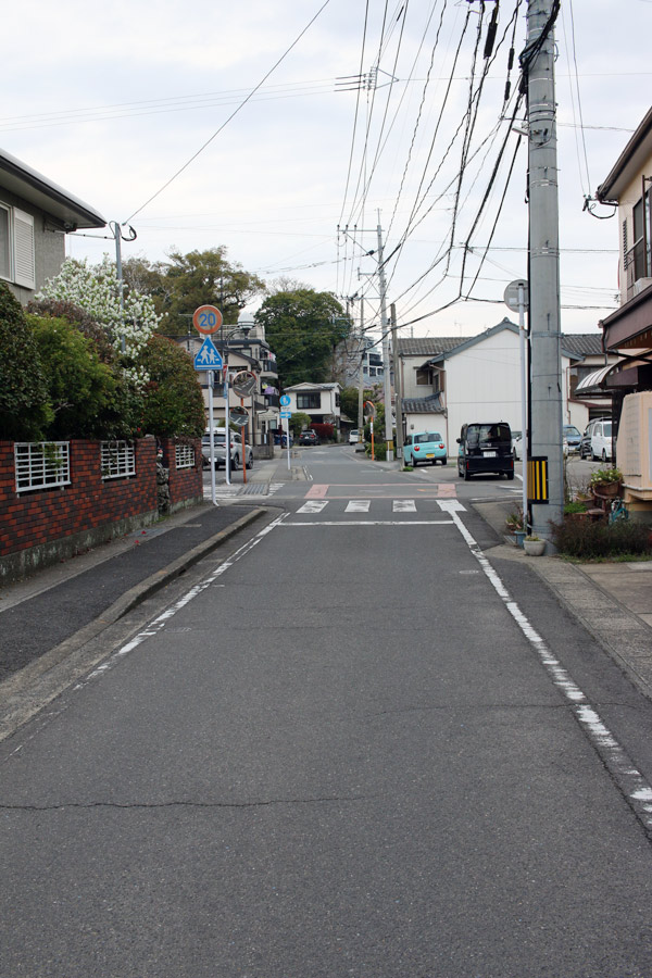 街道は、広い車道から右折(西方向)し細い路地へ、住宅の間をとおって行きます。