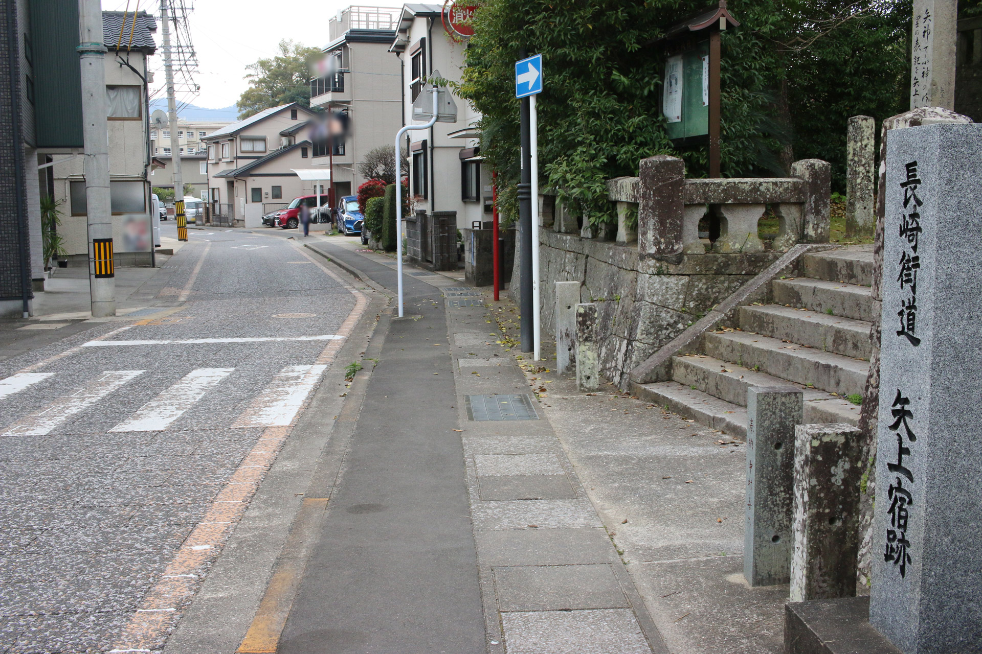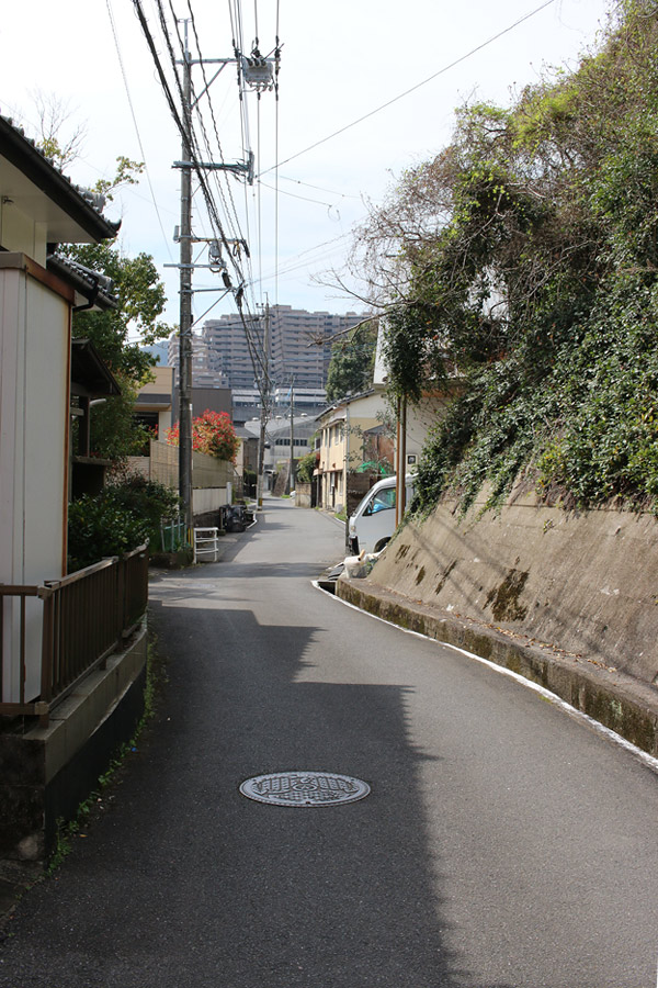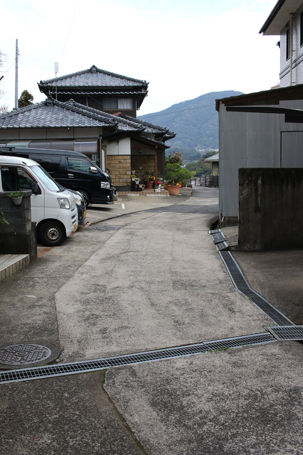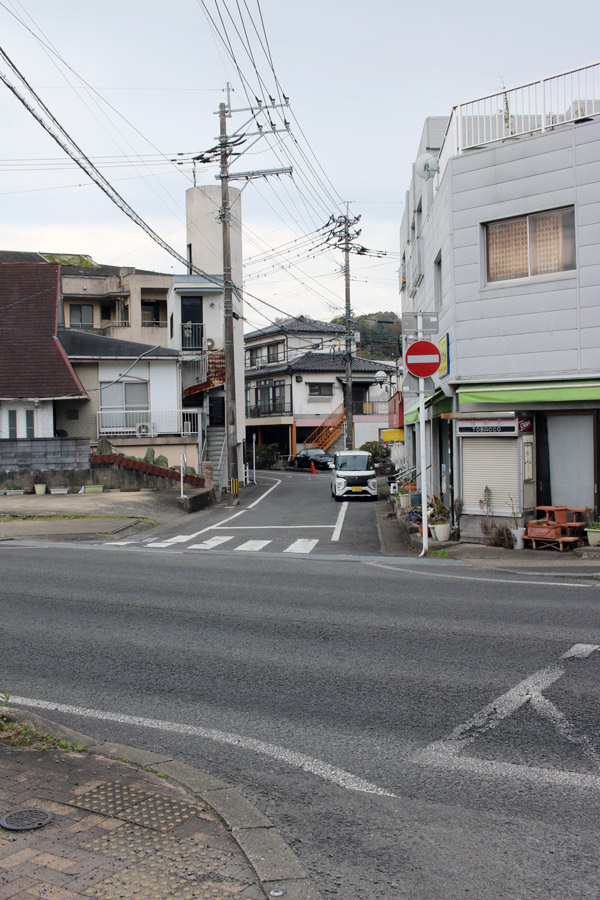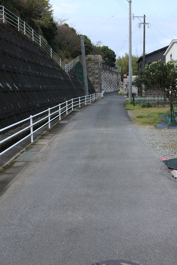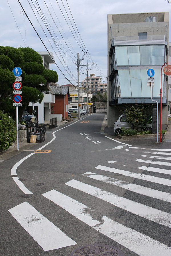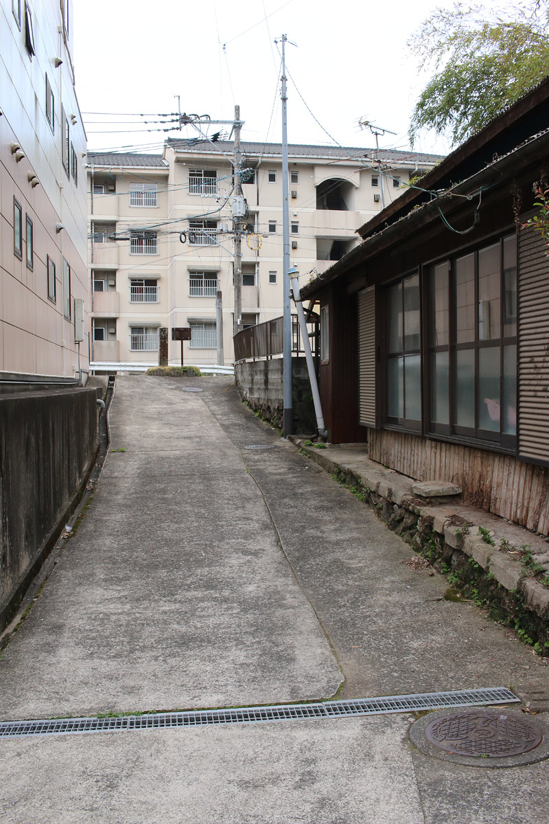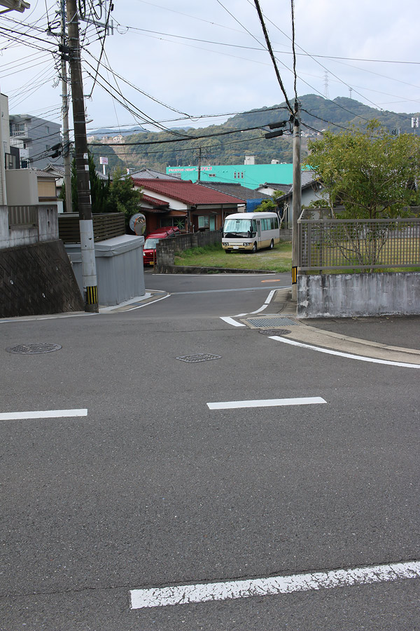 街道は、広い車道から右折(西方向)し細い路地へ、住宅の間をとおって行きます。
