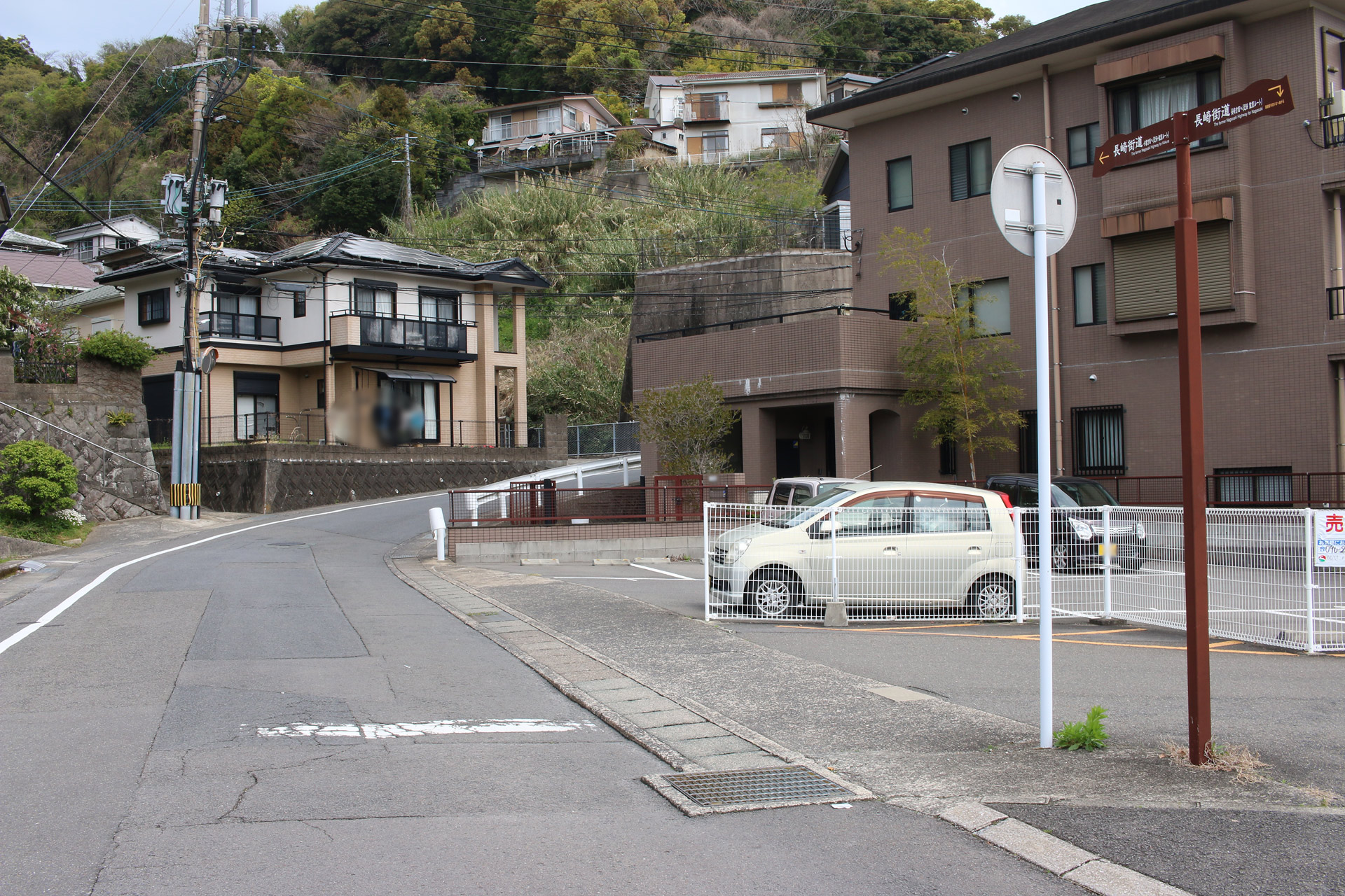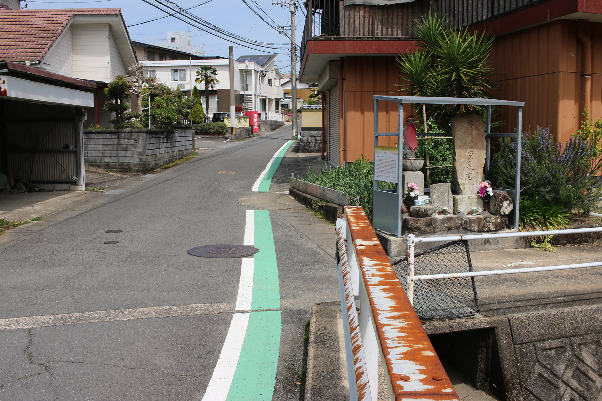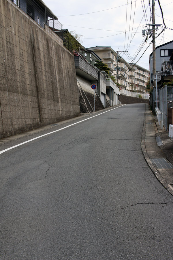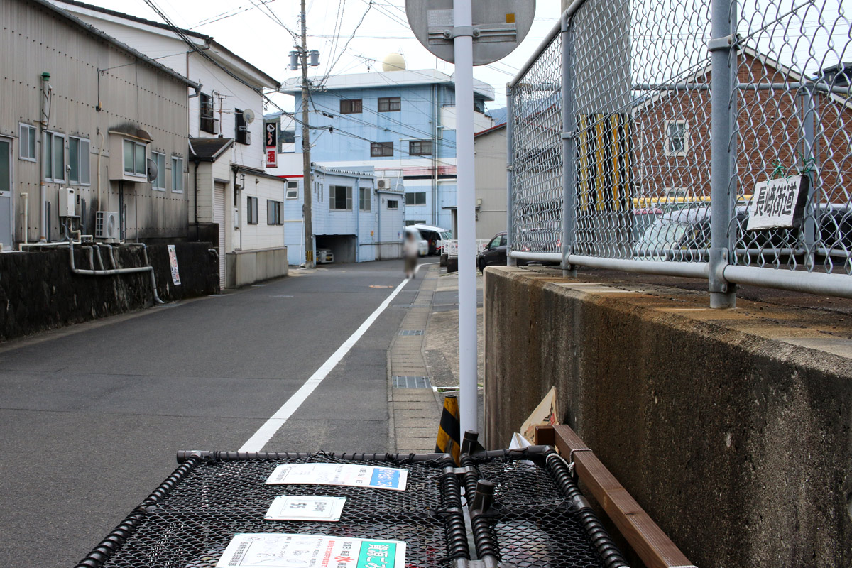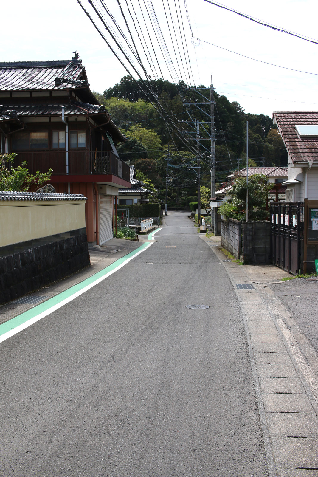 街道は、広い車道から右折(西方向)し細い路地へ、住宅の間をとおって行きます。