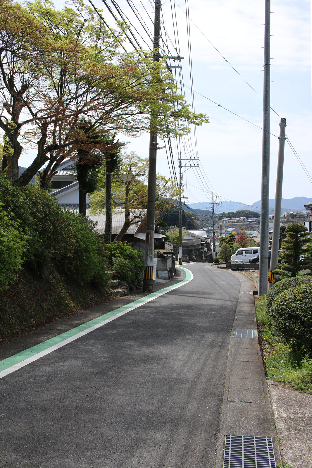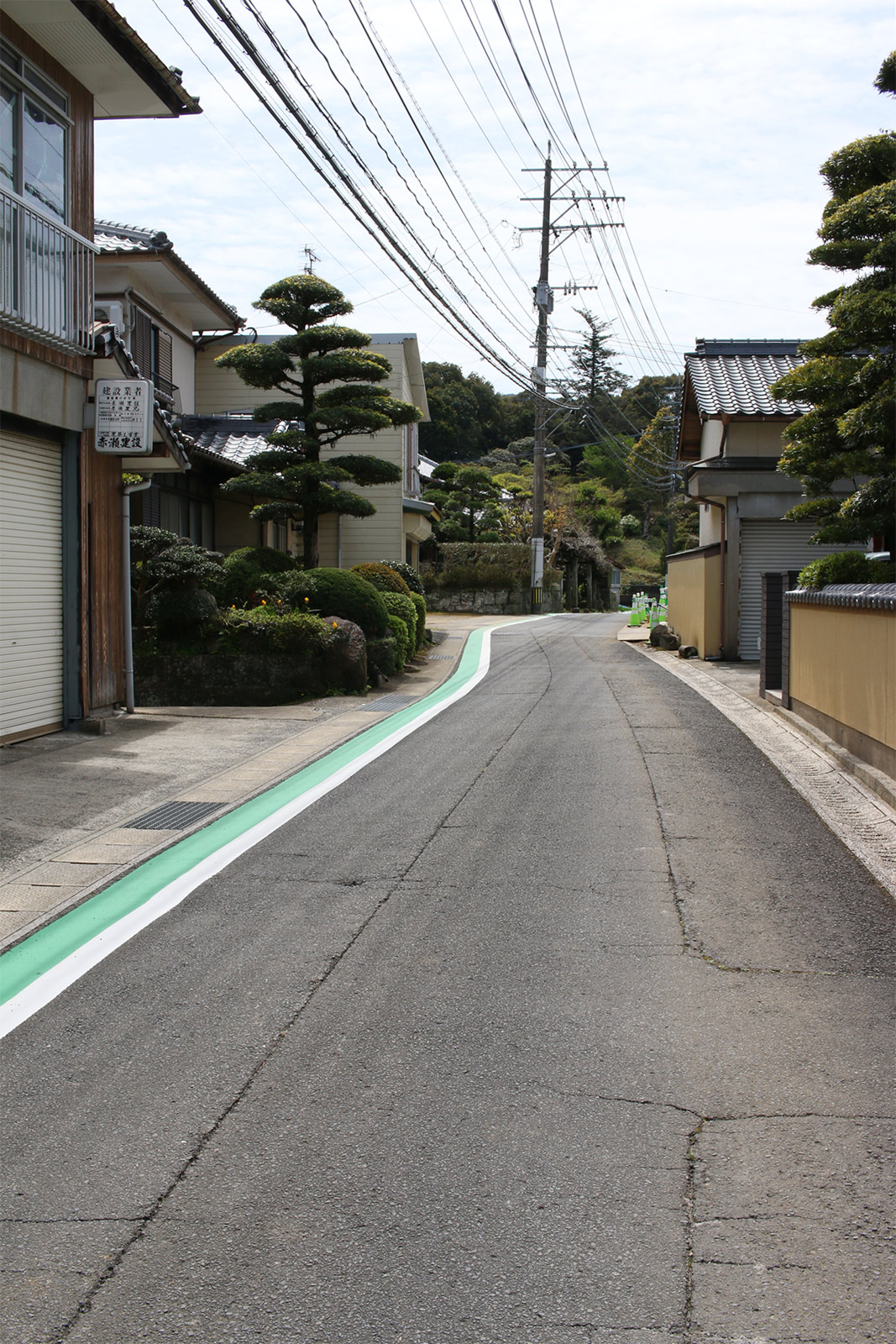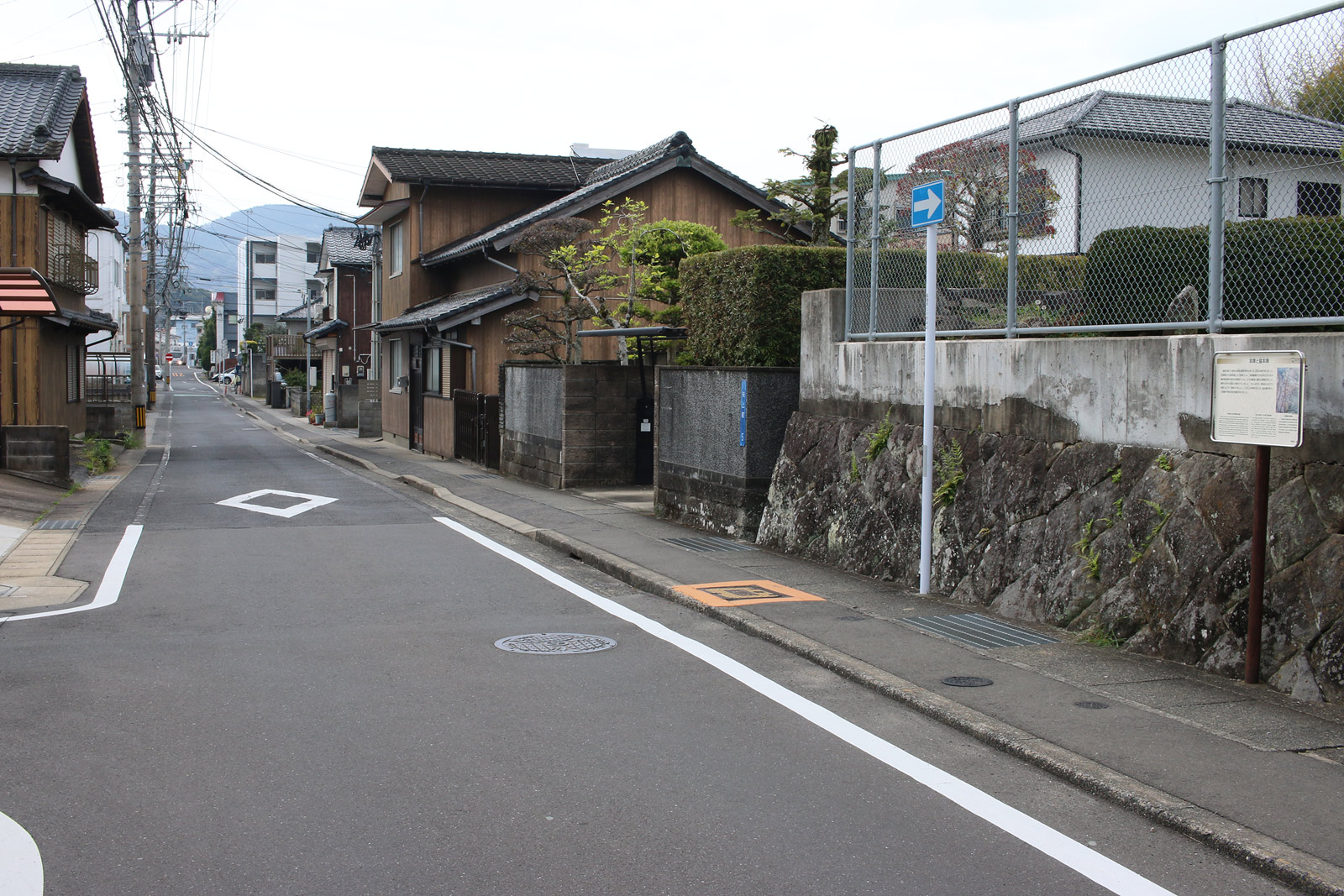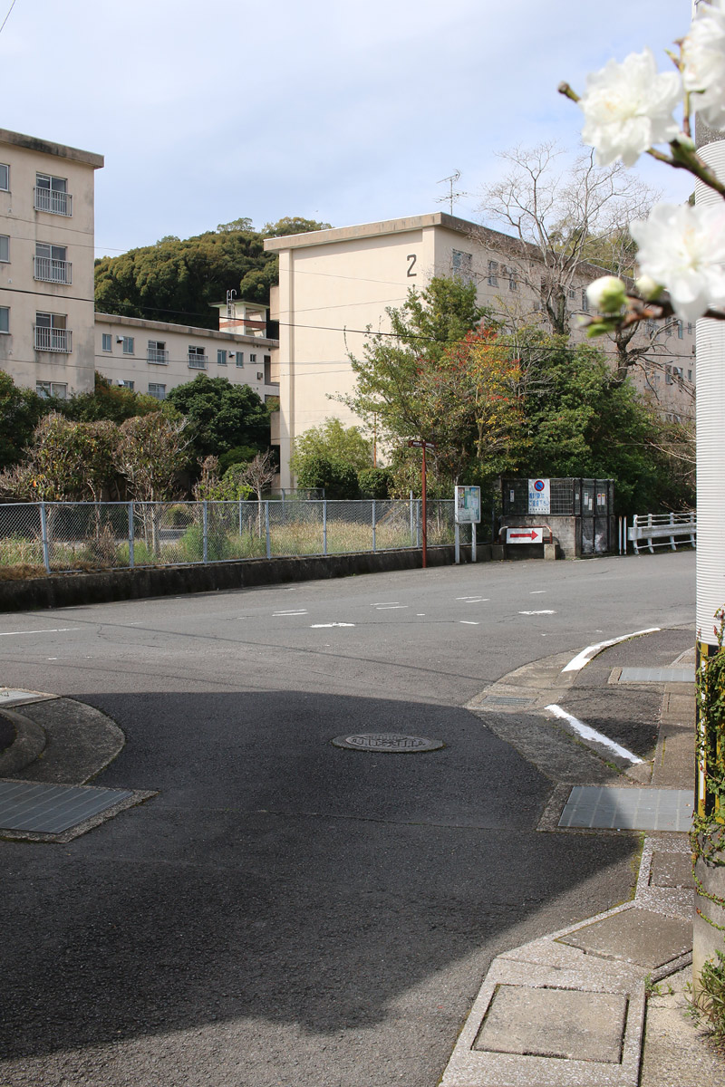 街道は、広い車道から右折(西方向)し細い路地へ、住宅の間をとおって行きます。