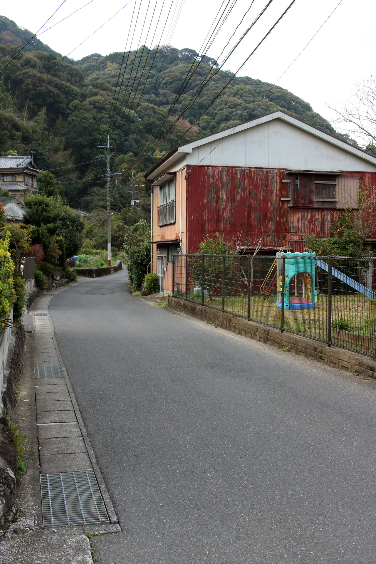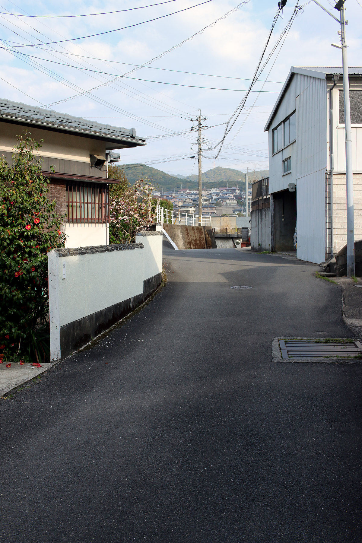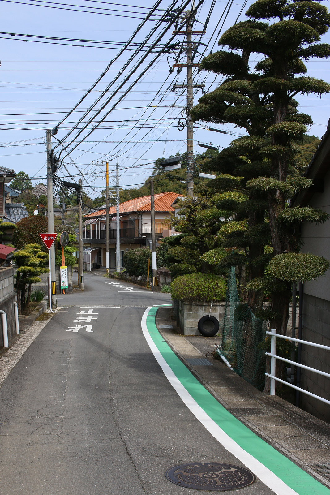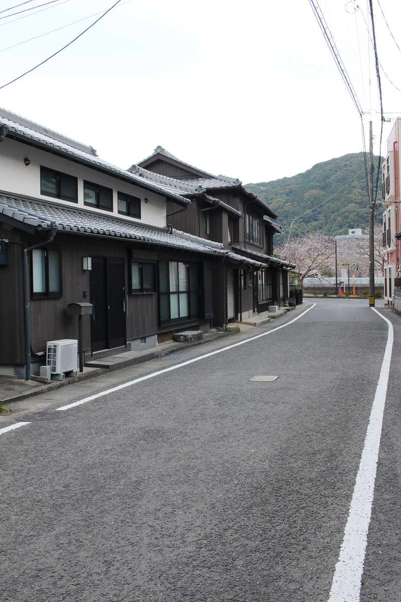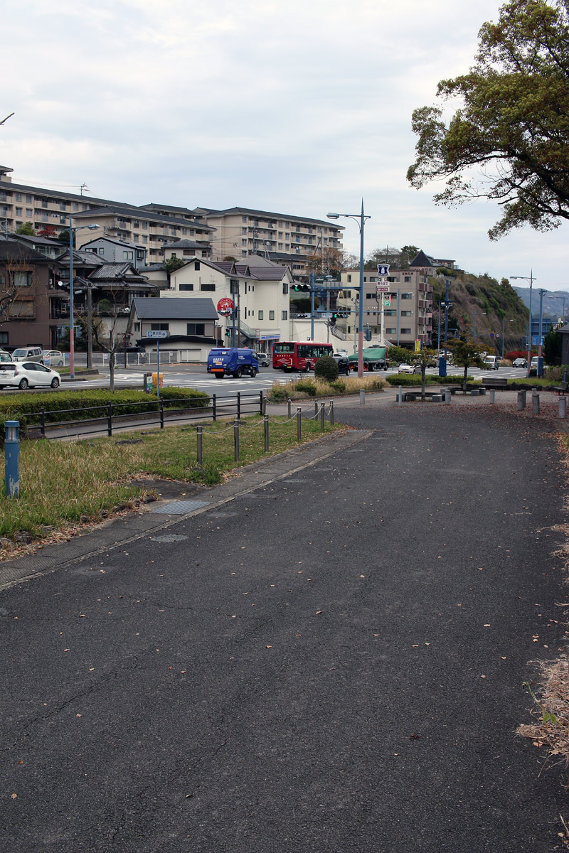 街道は、広い車道から右折(西方向)し細い路地へ、住宅の間をとおって行きます。
