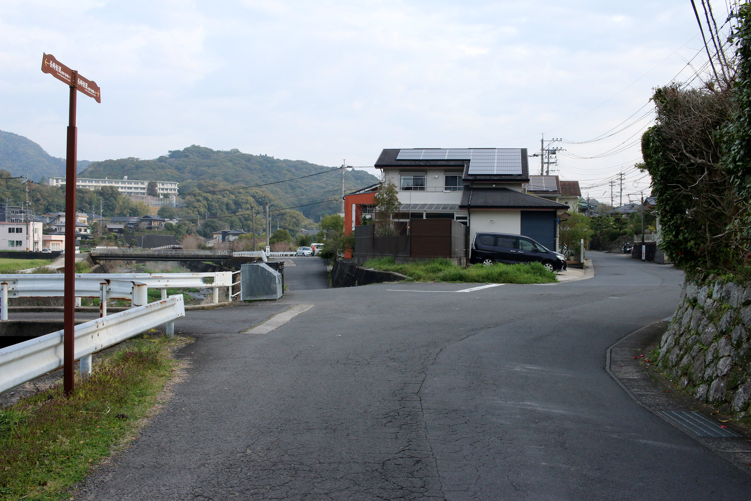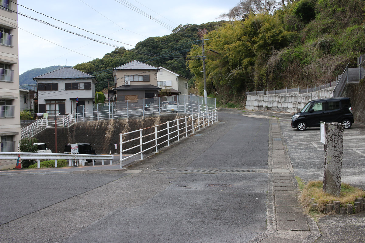先ほどの「右へ(古賀町404付近)」の道標に従い右に行くと、グーグルマップで「長崎街道」と記された道に合流します。しかし、そのルートでは道標を見つけることはできず…、かつ、先ほどの慶正庵橋付近で見た(「川沿いを進む」「迂回・散策ルート」と記された)道標とは道も食い違います。この辺りの詳細は、分かり次第、追記します。