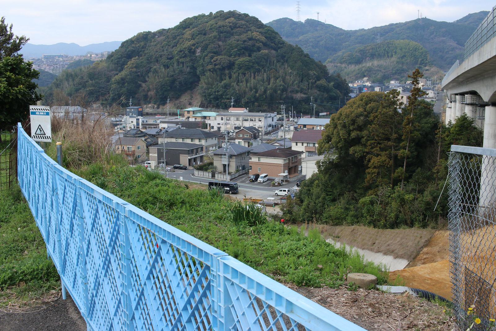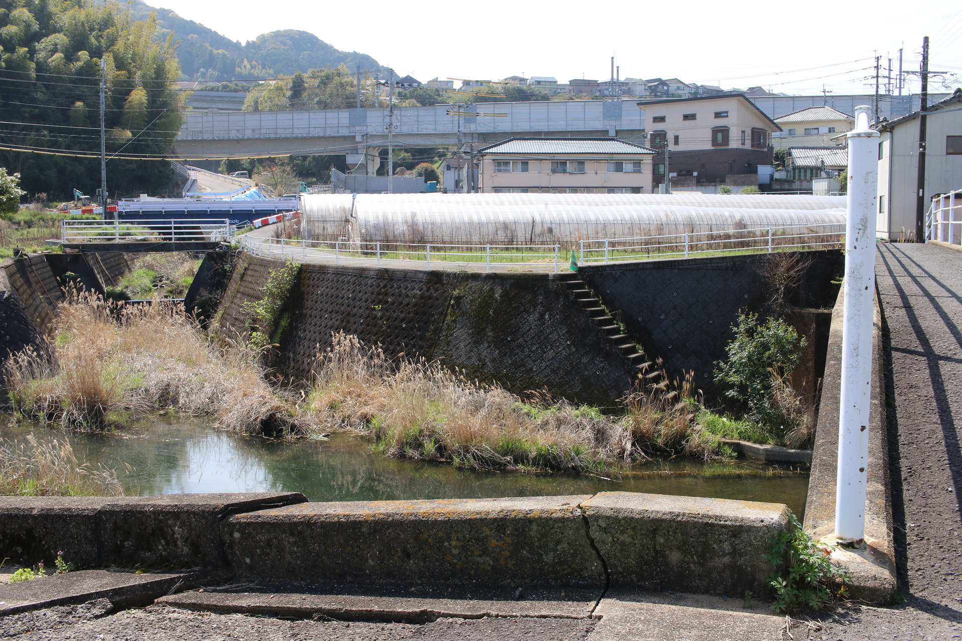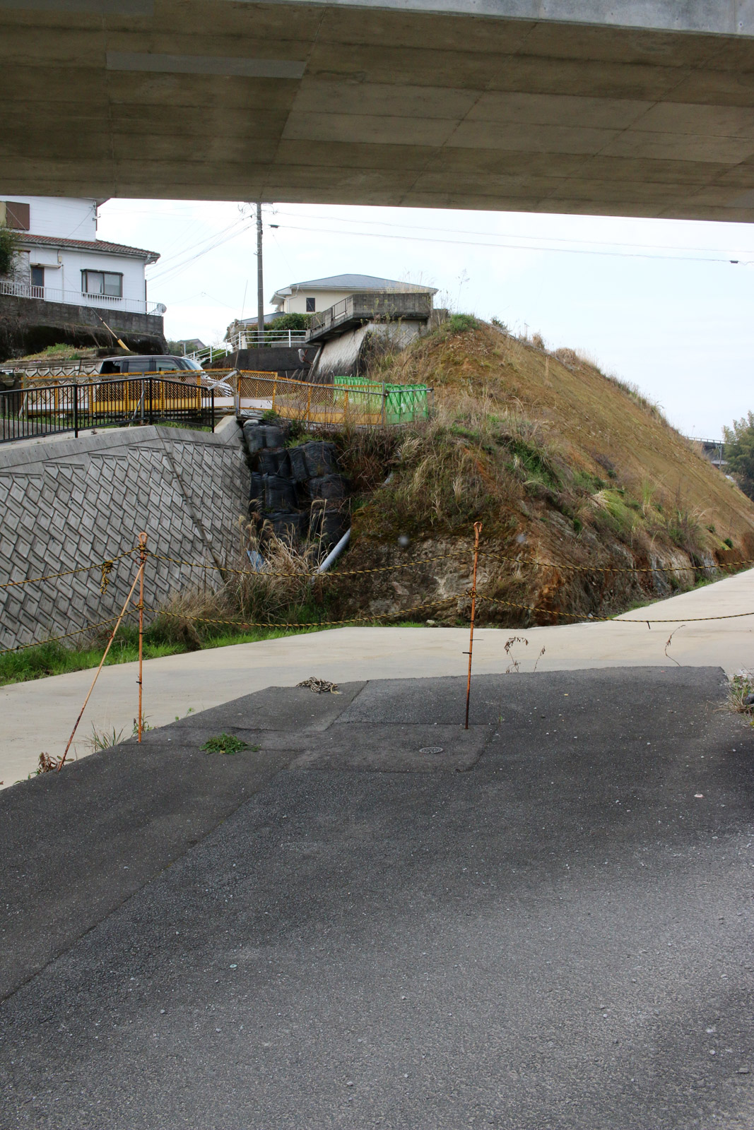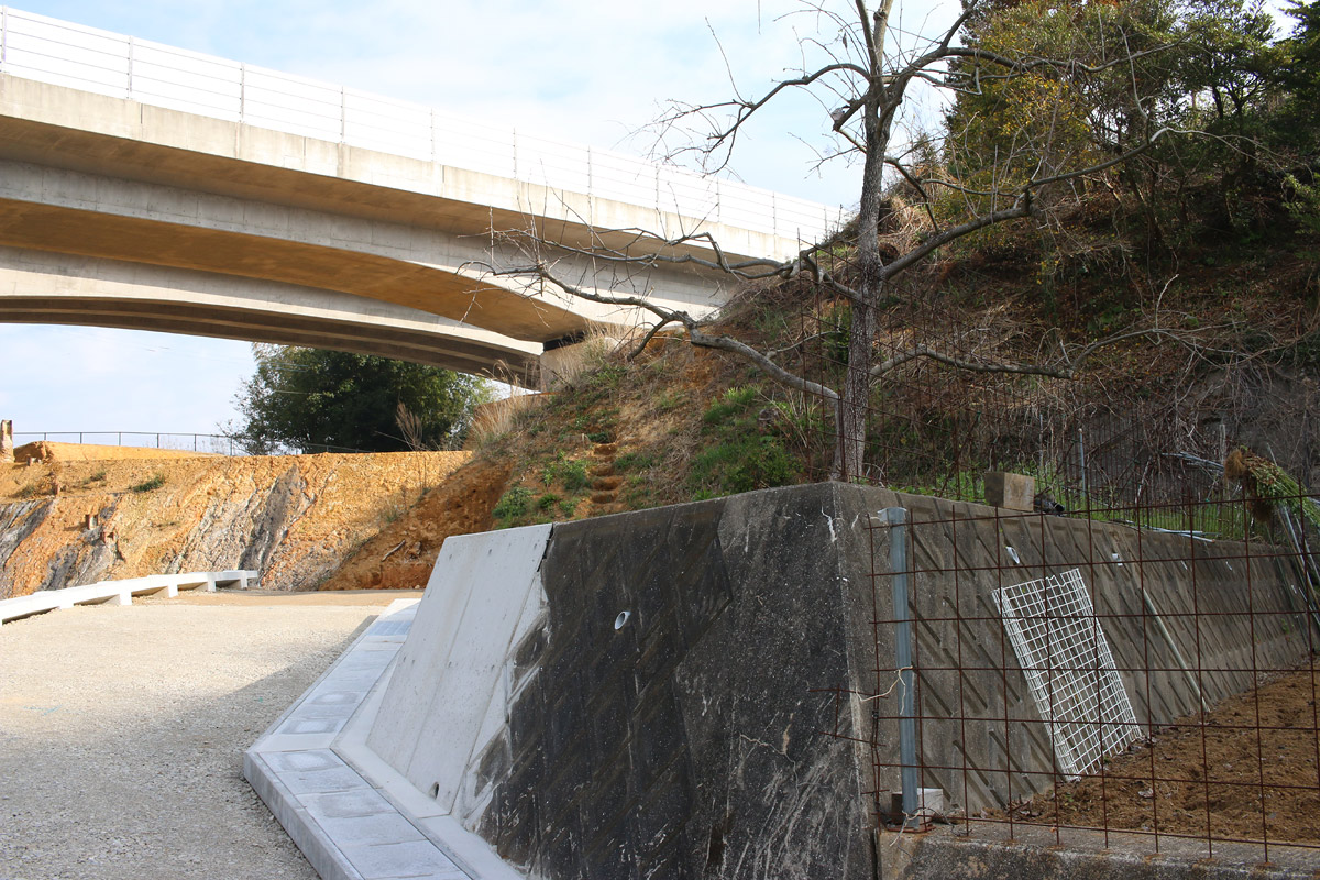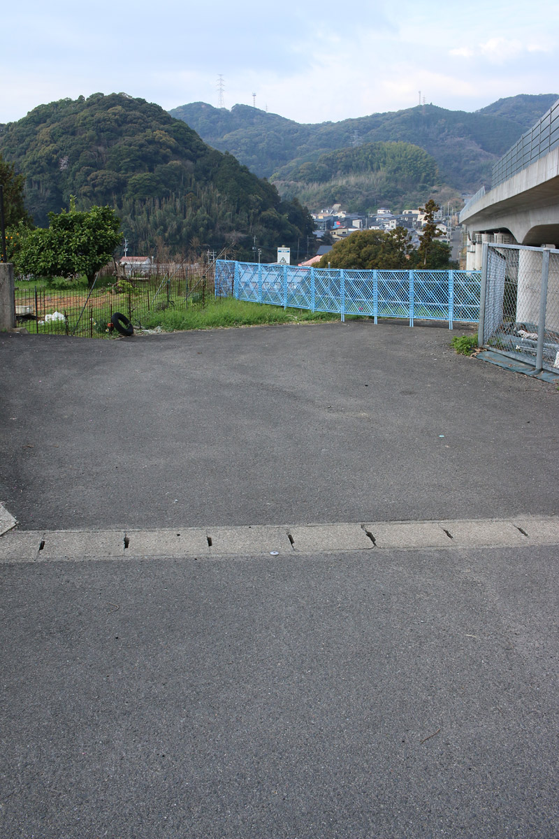 分断された街道を両端から望む(ただし、両端から互いの街道は見えない)。二枚目に道標が映っています。
