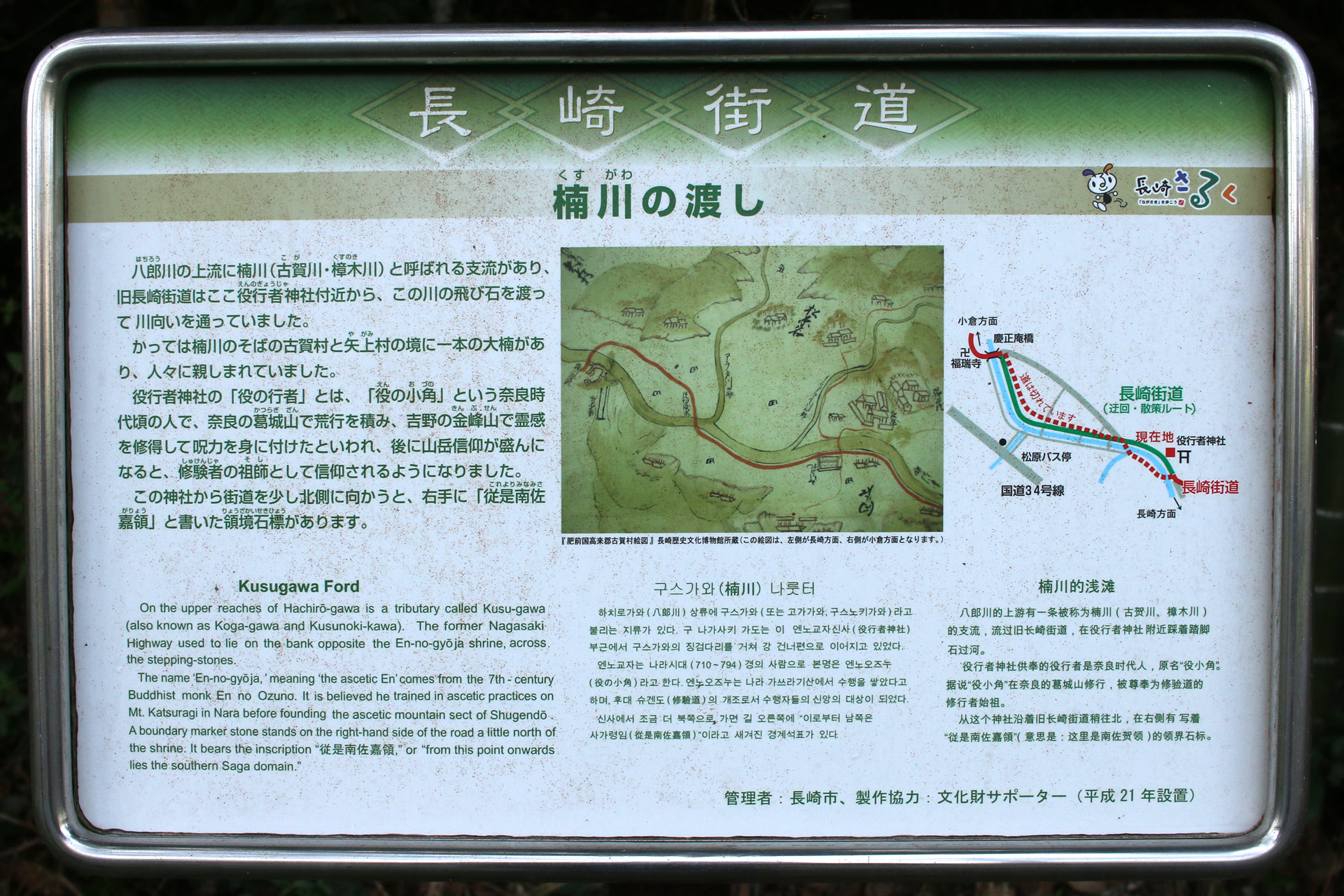楠川の渡し。八郎川の上流に楠川(古賀川・樟木川)と呼ばれる支流があり、旧長崎街道はここ役行者神社付近から、この川の飛び石を渡って川向いを通っていました。かっては楠川のそばの古賀村と矢上村の境に一本の大楠があり、人々に親しまれていました。役行者神社の「役の行者」とは、「役の小角」という奈良時代頃の人で、奈良の葛城山で荒行を積み、吉野の金峰山で霊感を修得して呪力を身に付けたといわれ、後に山岳信仰が盛んになると、修験者の祖師として信仰されるようになりました。この神社から街道を少し北側に向かうと、右手に「従是南佐嘉領」と書いた領境石標があります。(案内板より引用)