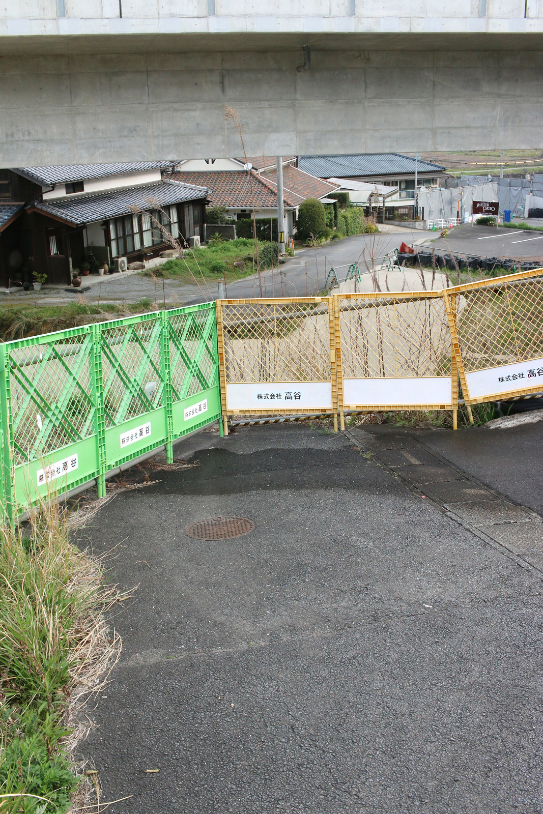 街道が工事で分断されておりました(黄色と緑のフェンスが目印。三枚目と四枚目が分断された道の両端)。この後、しばらく街道の目印のない道が続いたのち、また街道が分断され、行き止まりとなります。