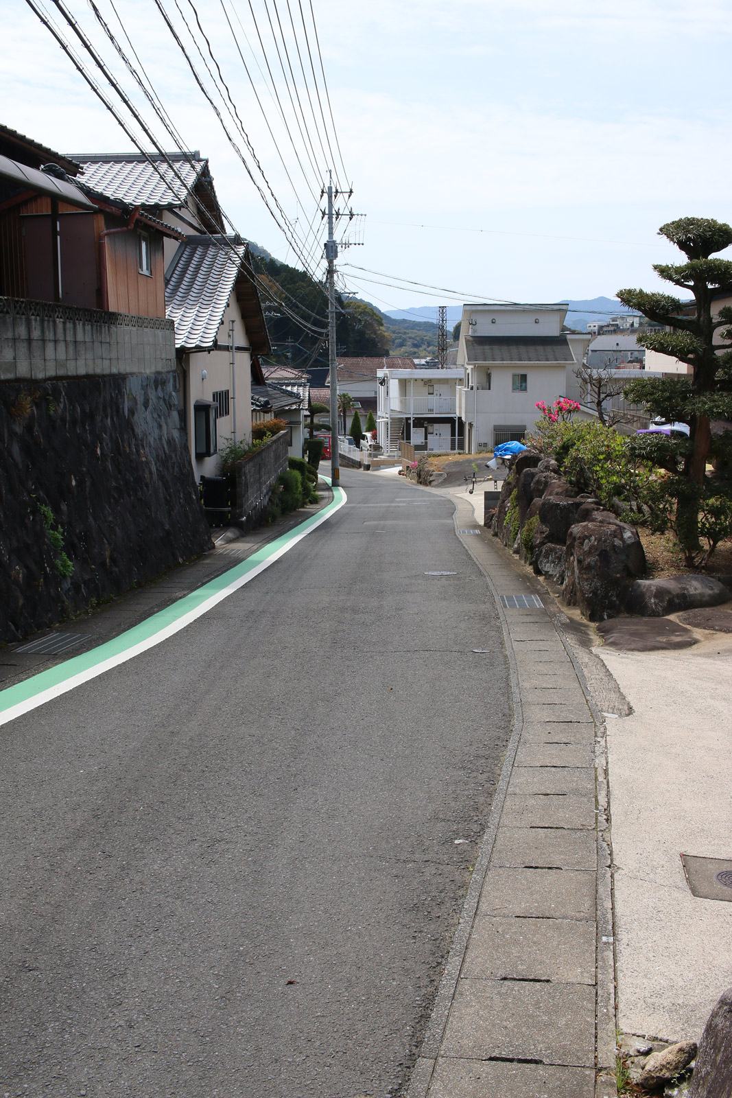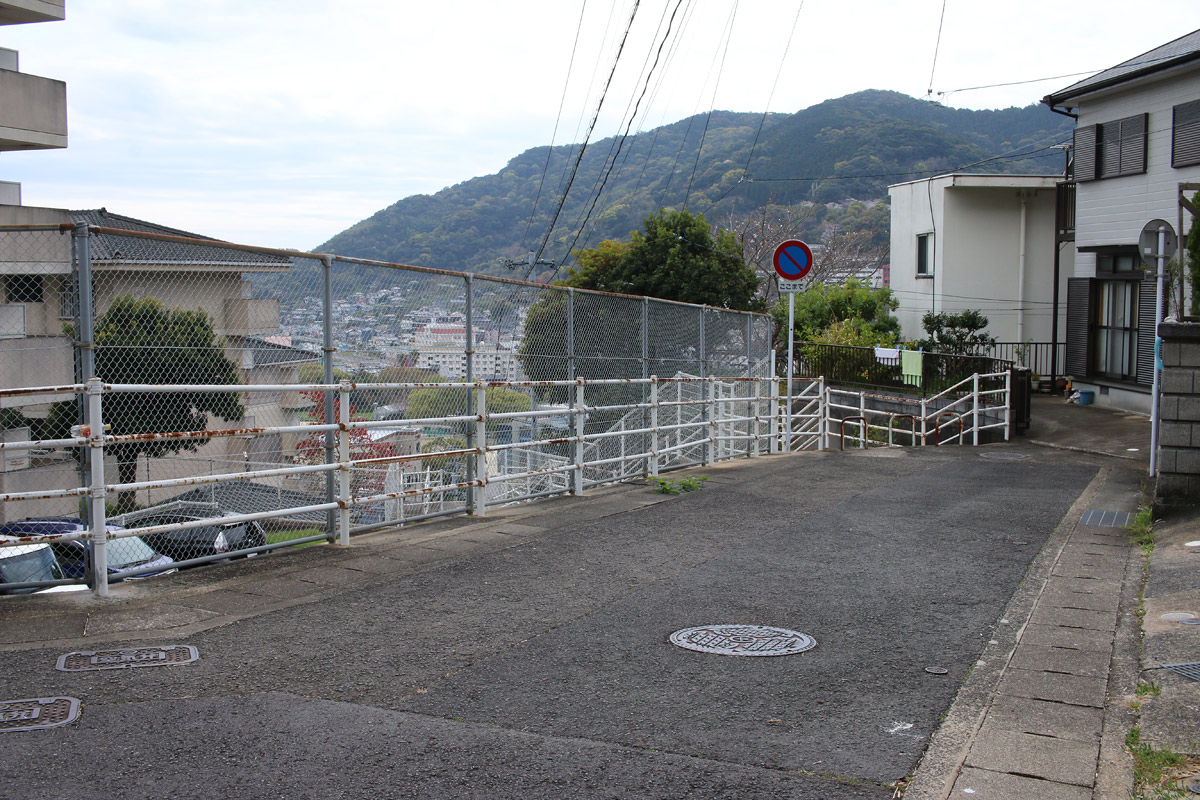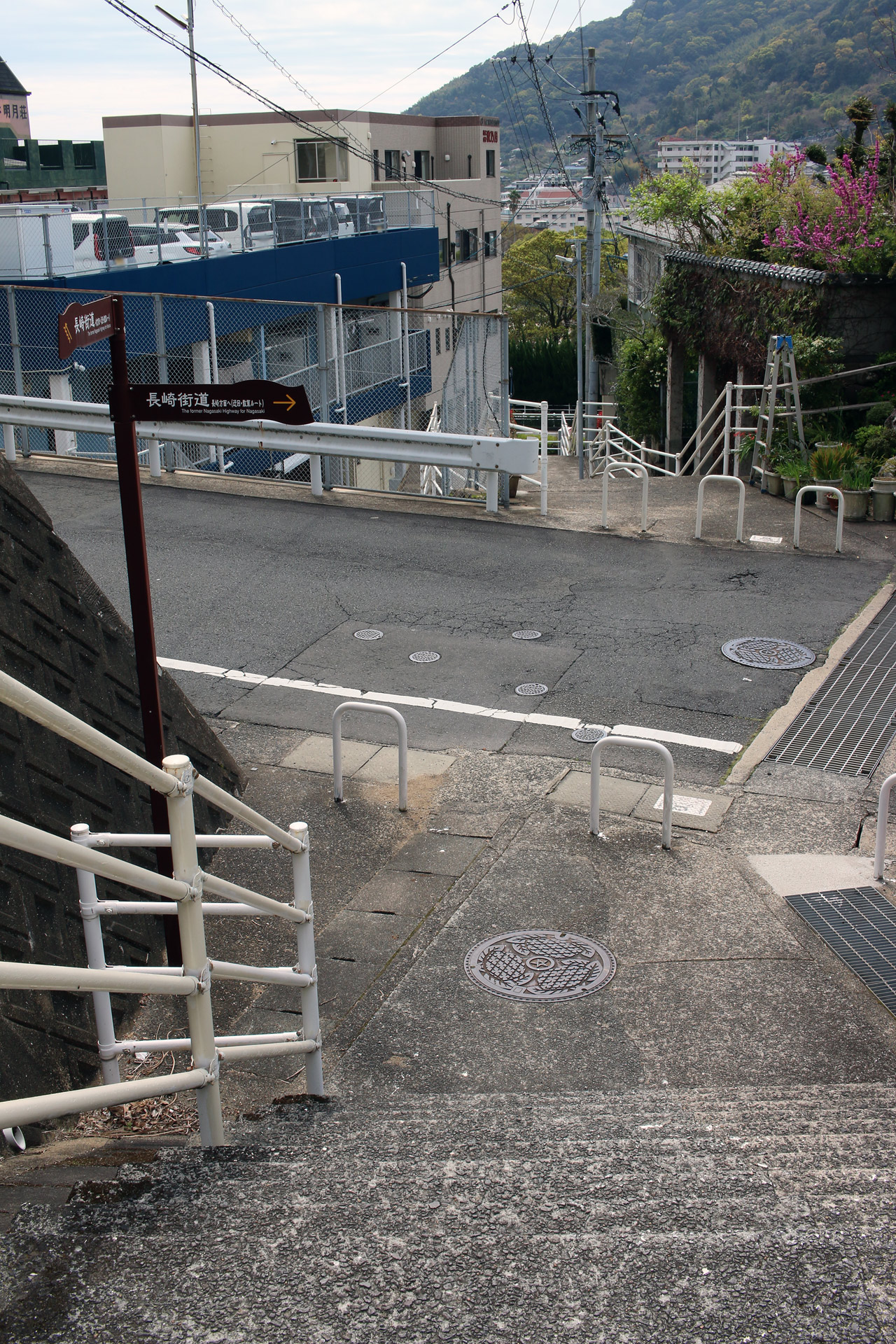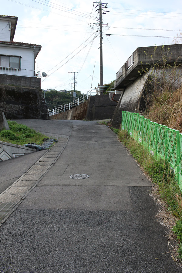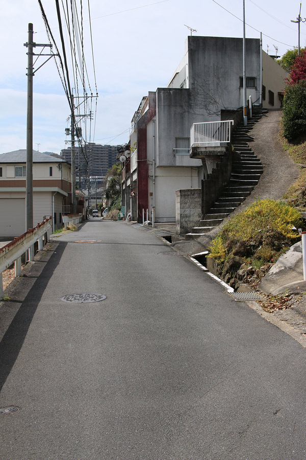 腹切坂を進み「日見峠道浪漫」の案内板と「ハーレーダビッドソン長崎」の前を通ると、そのすぐ近くの細い坂を下ると、再び細い街道らしい道へ入ります。