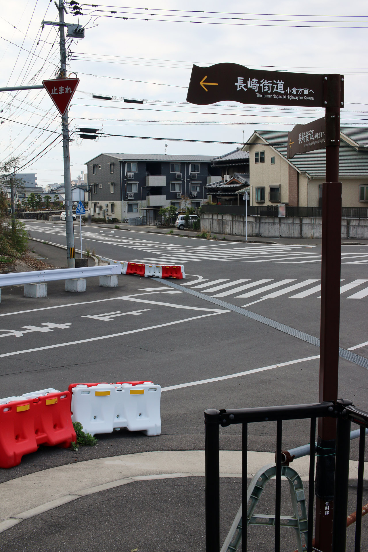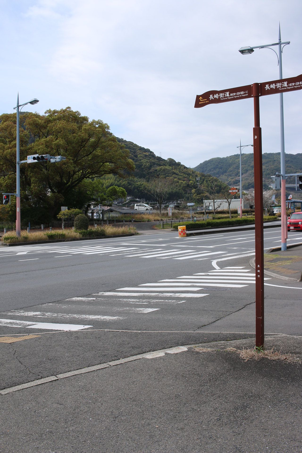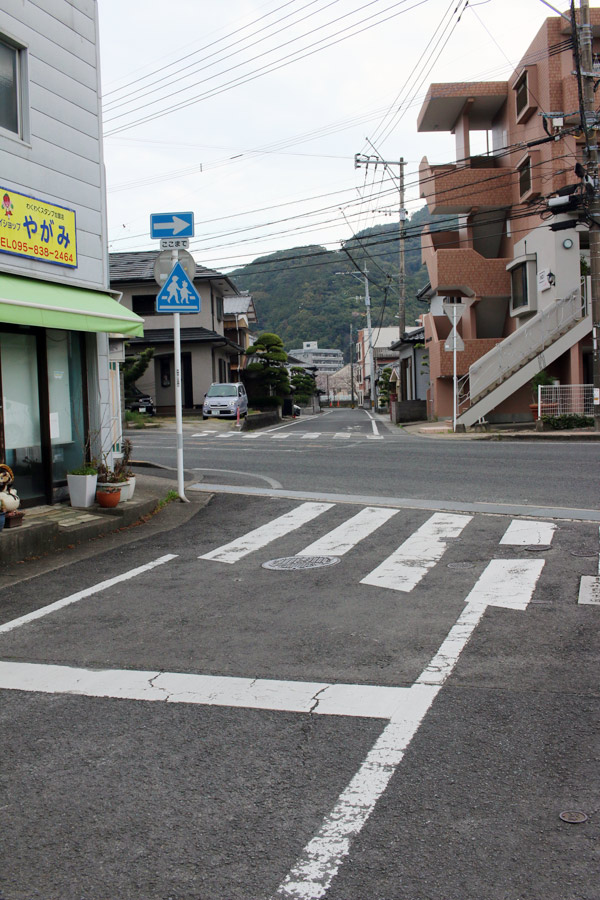 ここの交差点が長崎街道と島原街道の交差点(T字の交差点)のよう。なお、一枚目の写真に写っている奥に進む真っすぐの道路は島原街道でも長崎街道でもない。(紛らわしい写真の撮り方をしてしまいました)