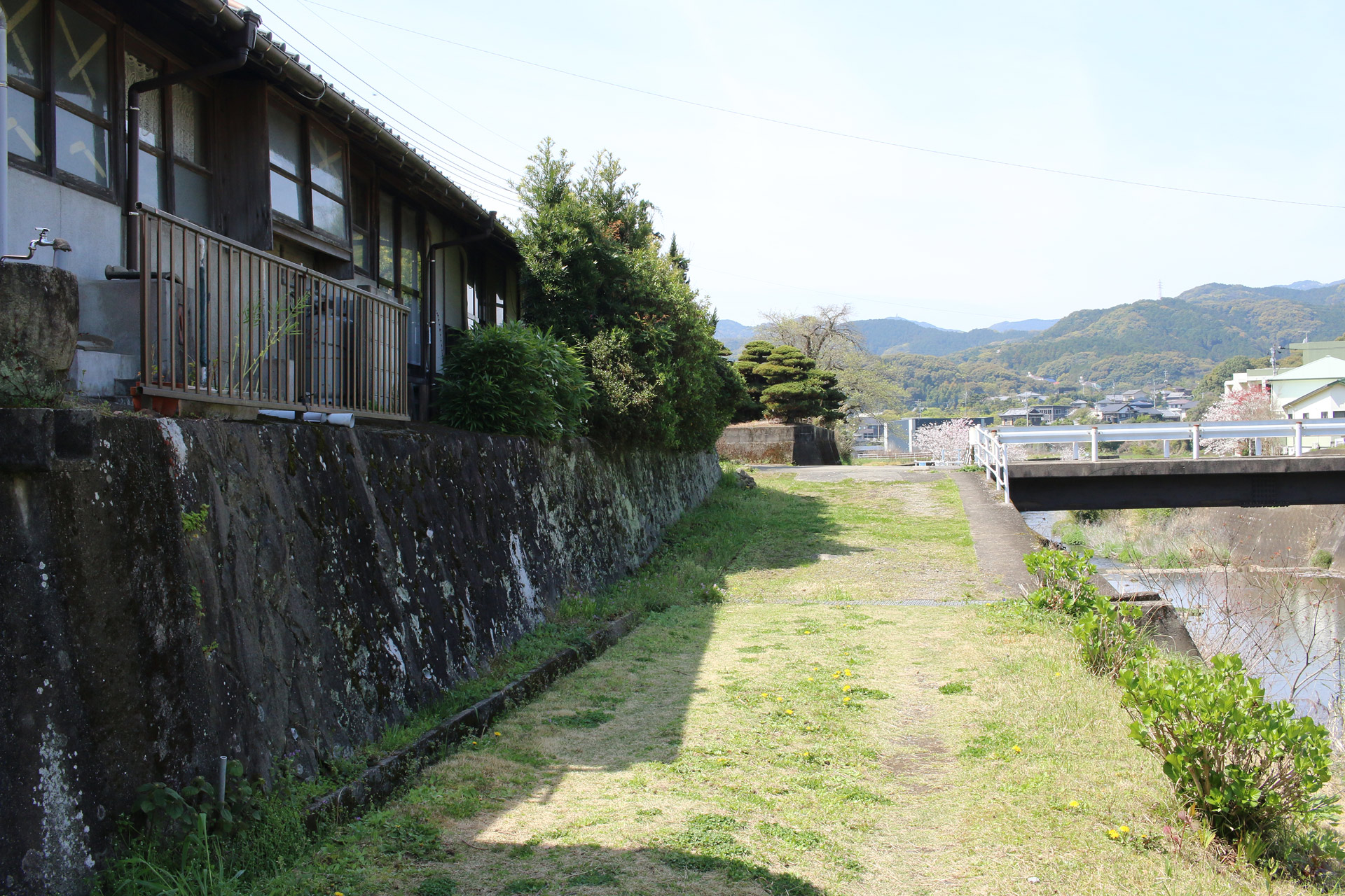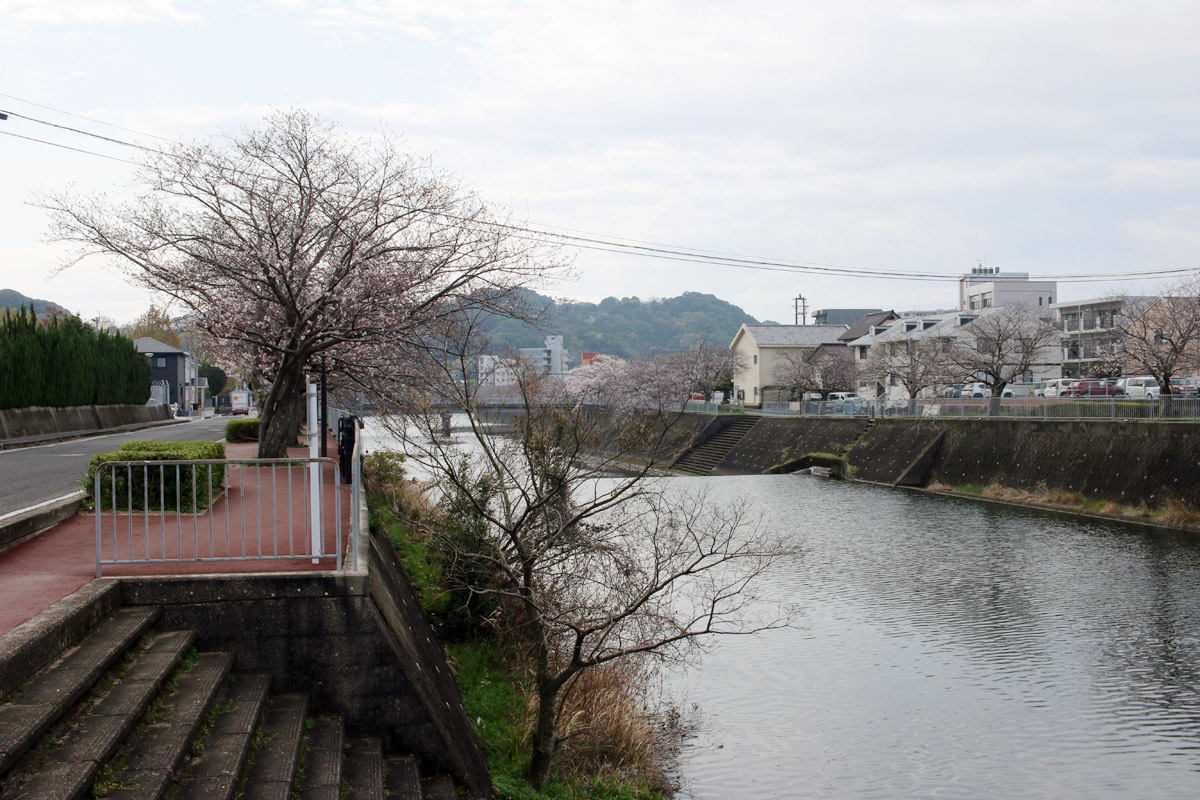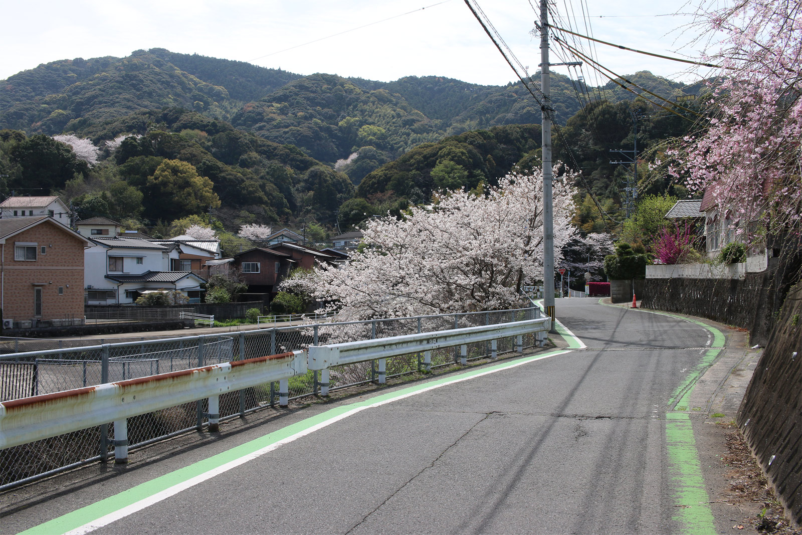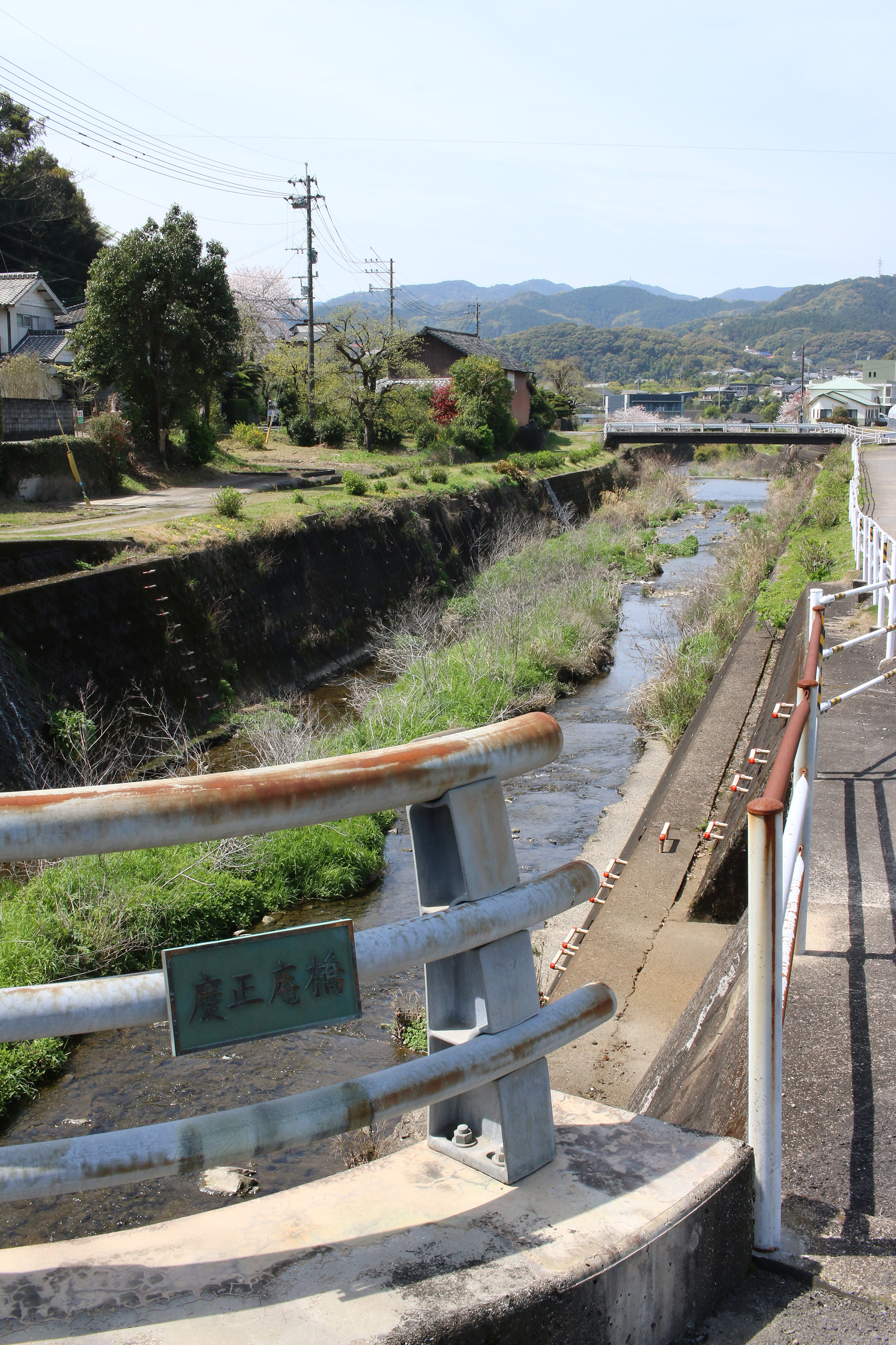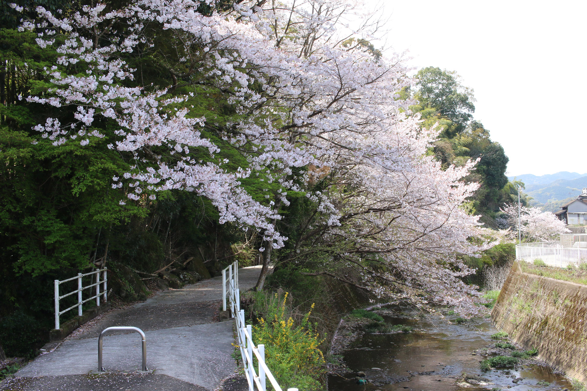 ここで左側に八郎川が現れます。この八郎川とともに街道を下って行くこととなります。街道は二枚目の正面のお家の右側の道を進むこととなりますが、その前に、八郎川の見事な桜をパシャリ(三・四枚目)。