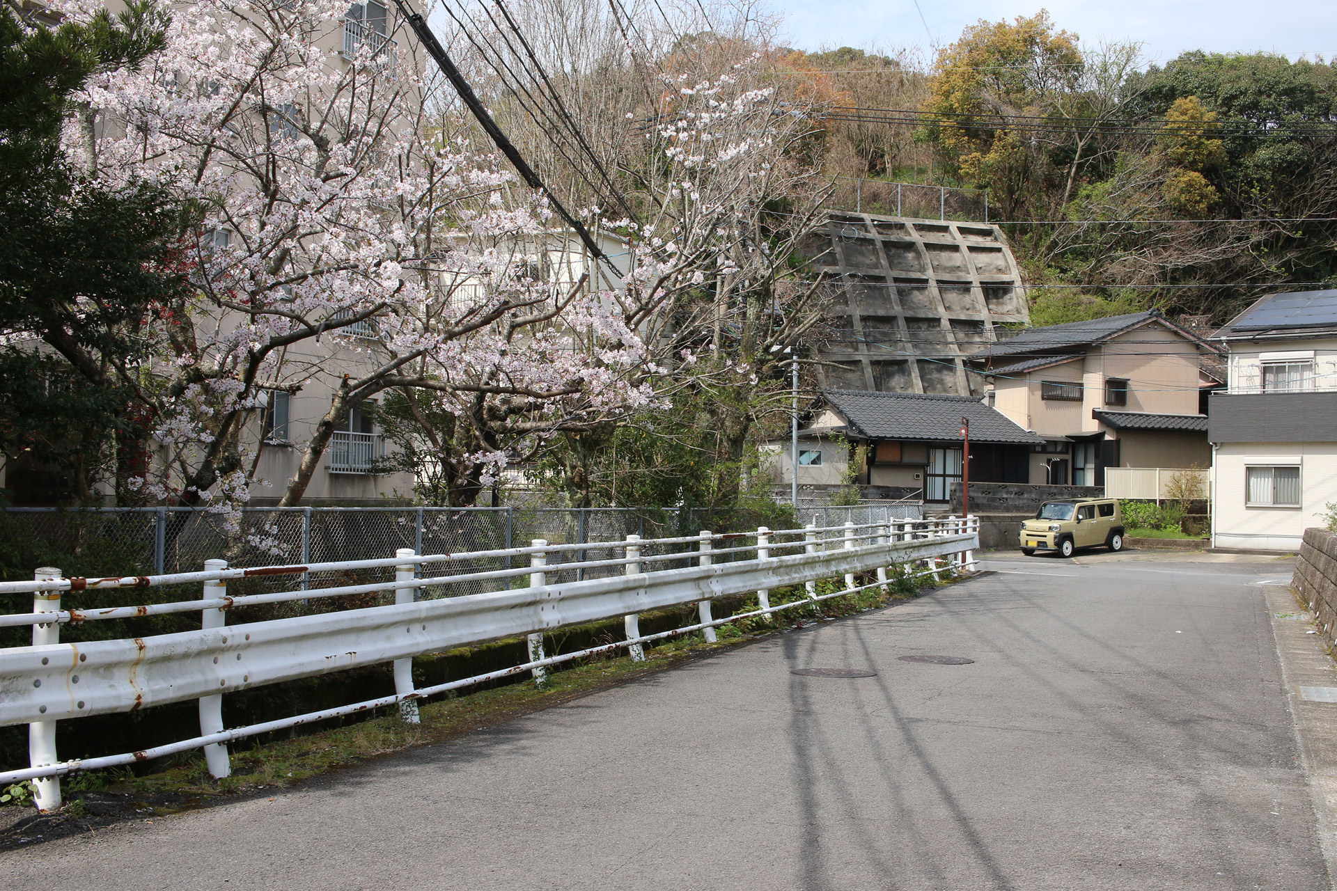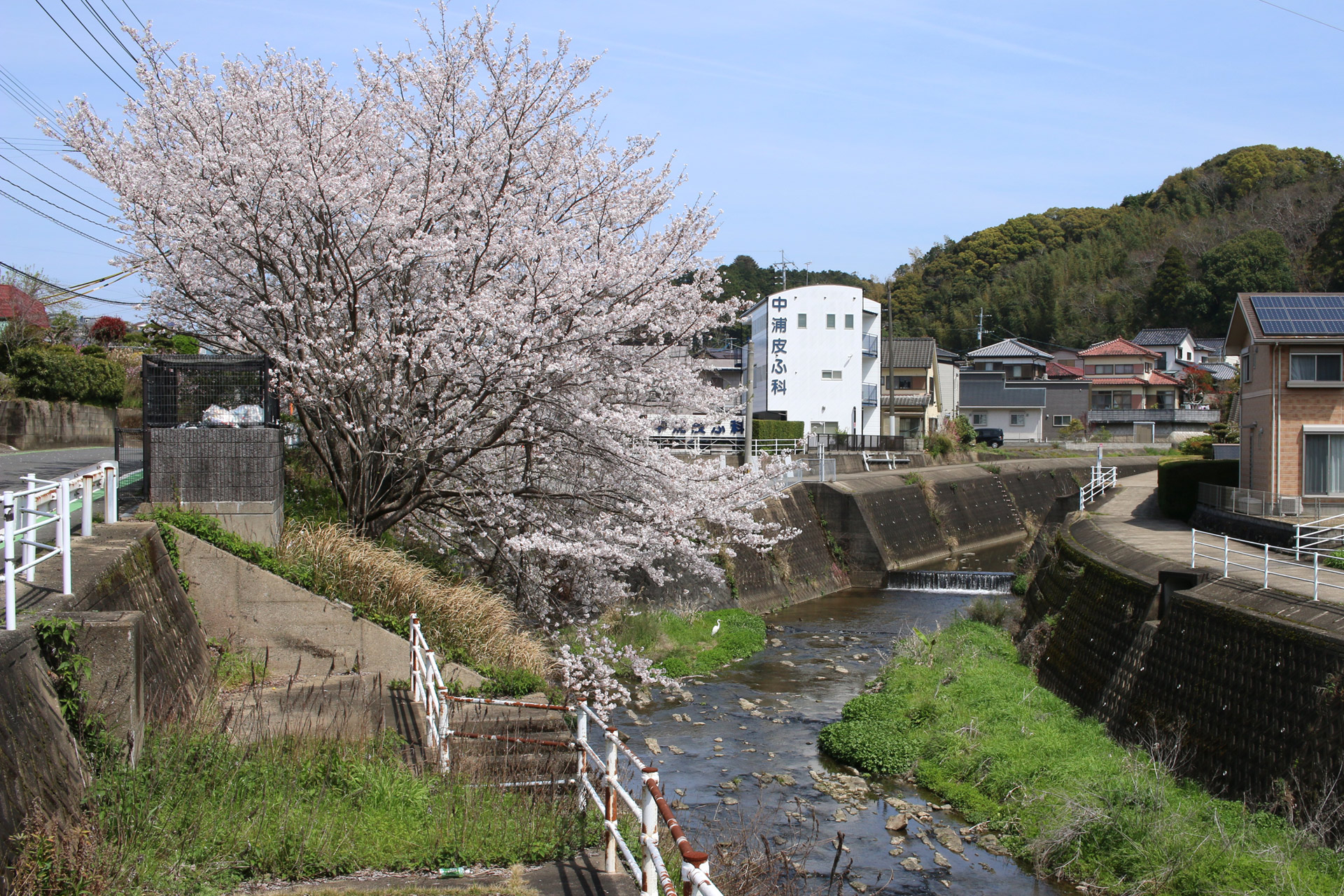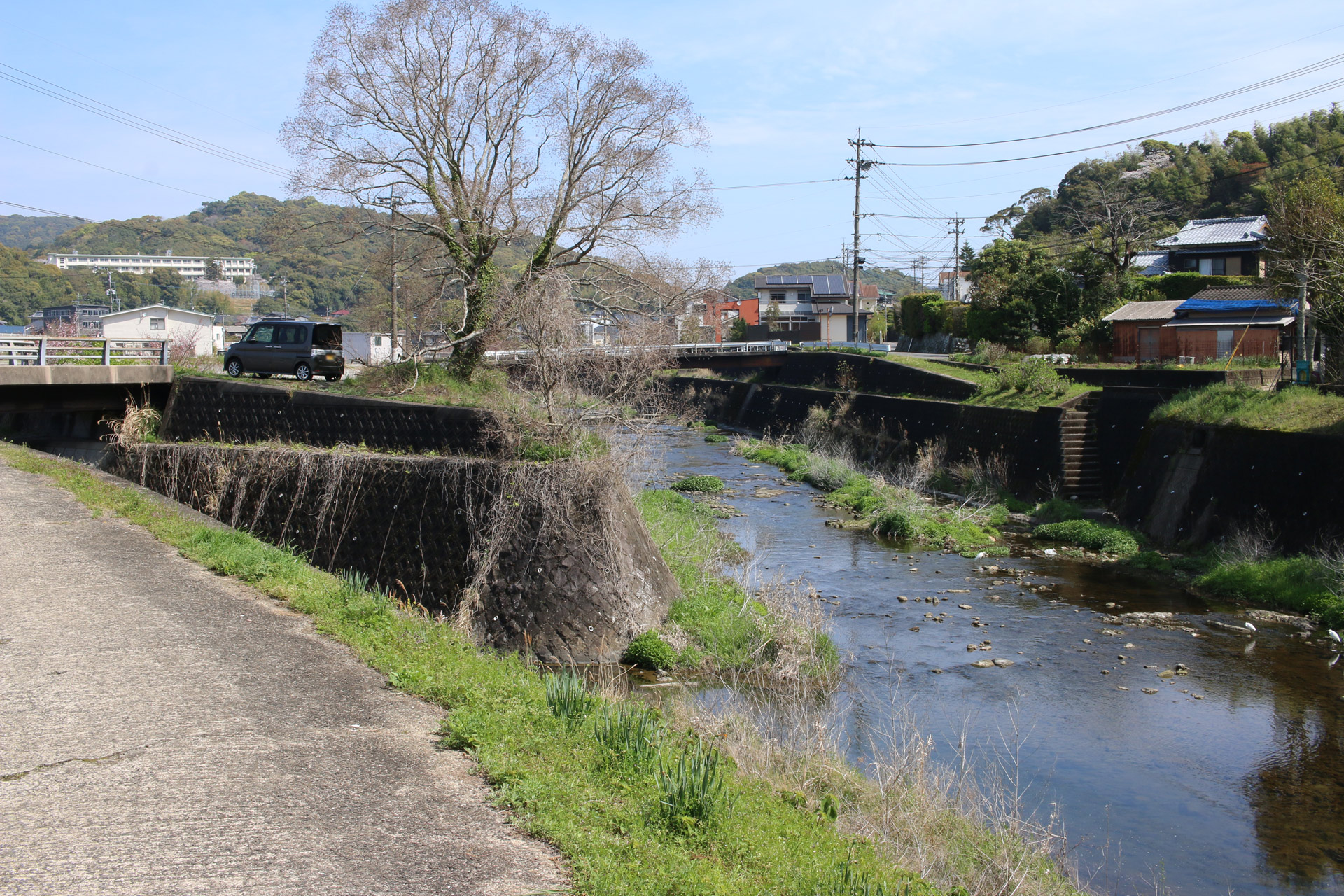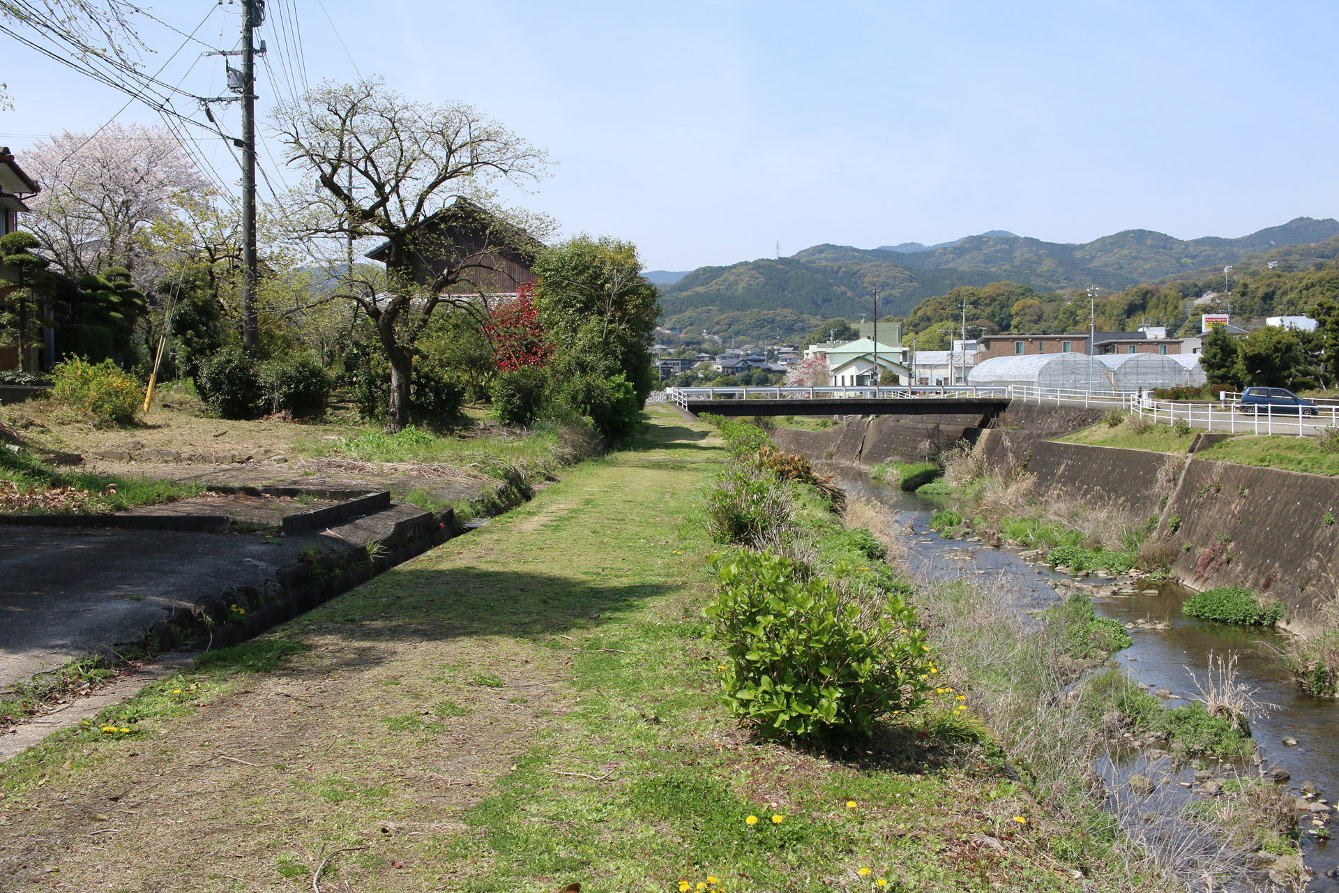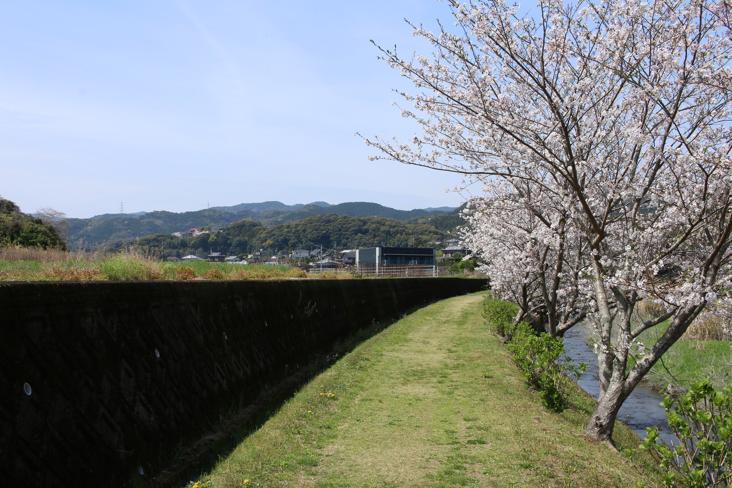 ここで左側に八郎川が現れます。この八郎川とともに街道を下って行くこととなります。街道は二枚目の正面のお家の右側の道を進むこととなりますが、その前に、八郎川の見事な桜をパシャリ(三・四枚目)。