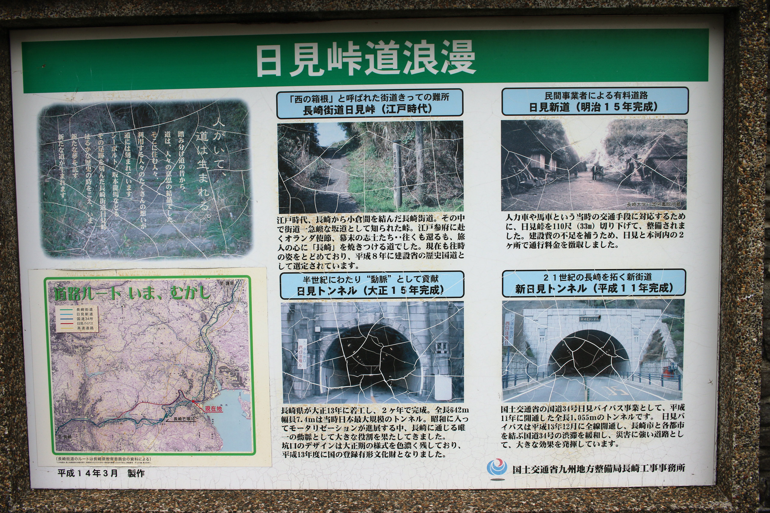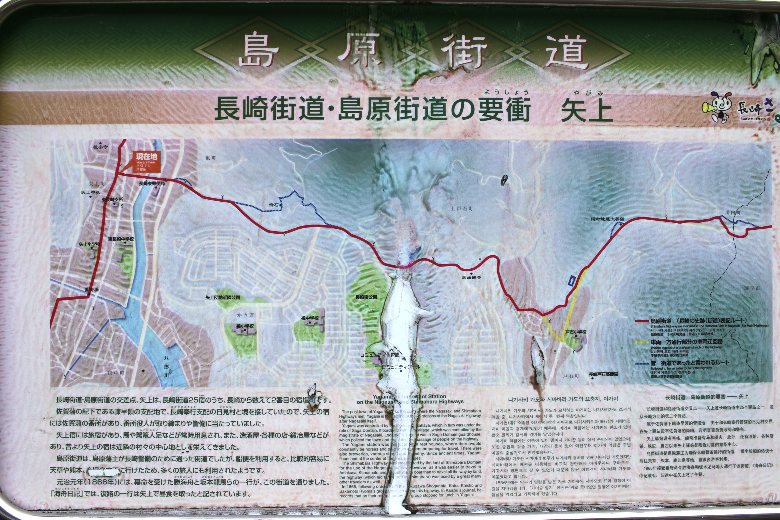 とくに目印も見つけられず街道を歩いていると、ここで「長崎街道・島原街道の要衝」の案内板を発見。なかなか案内板の痛みが目立ちますが、下に内容の引用文を記述します。