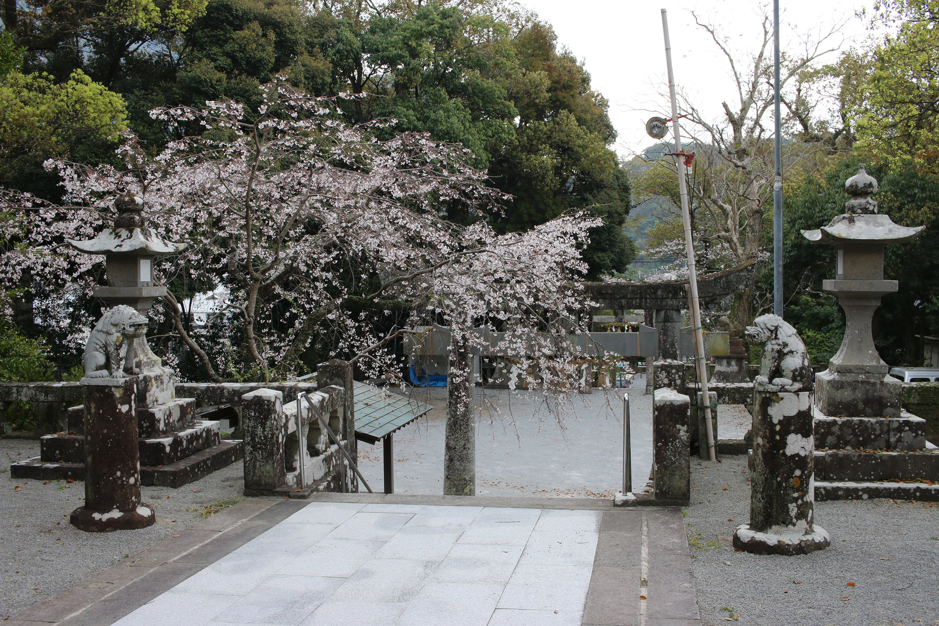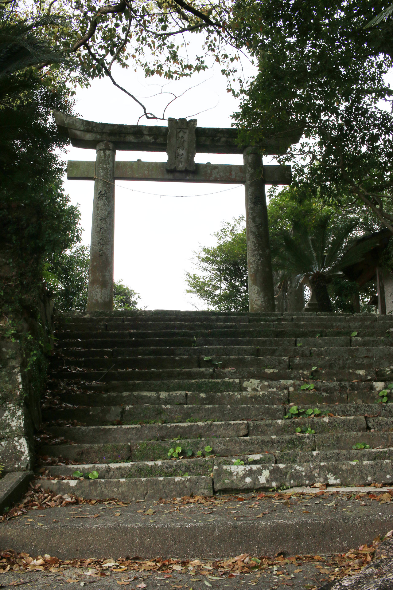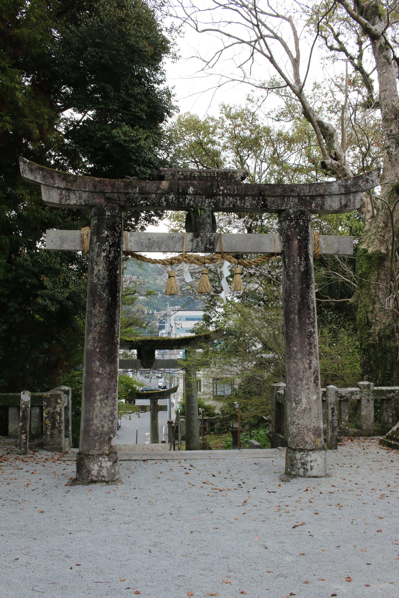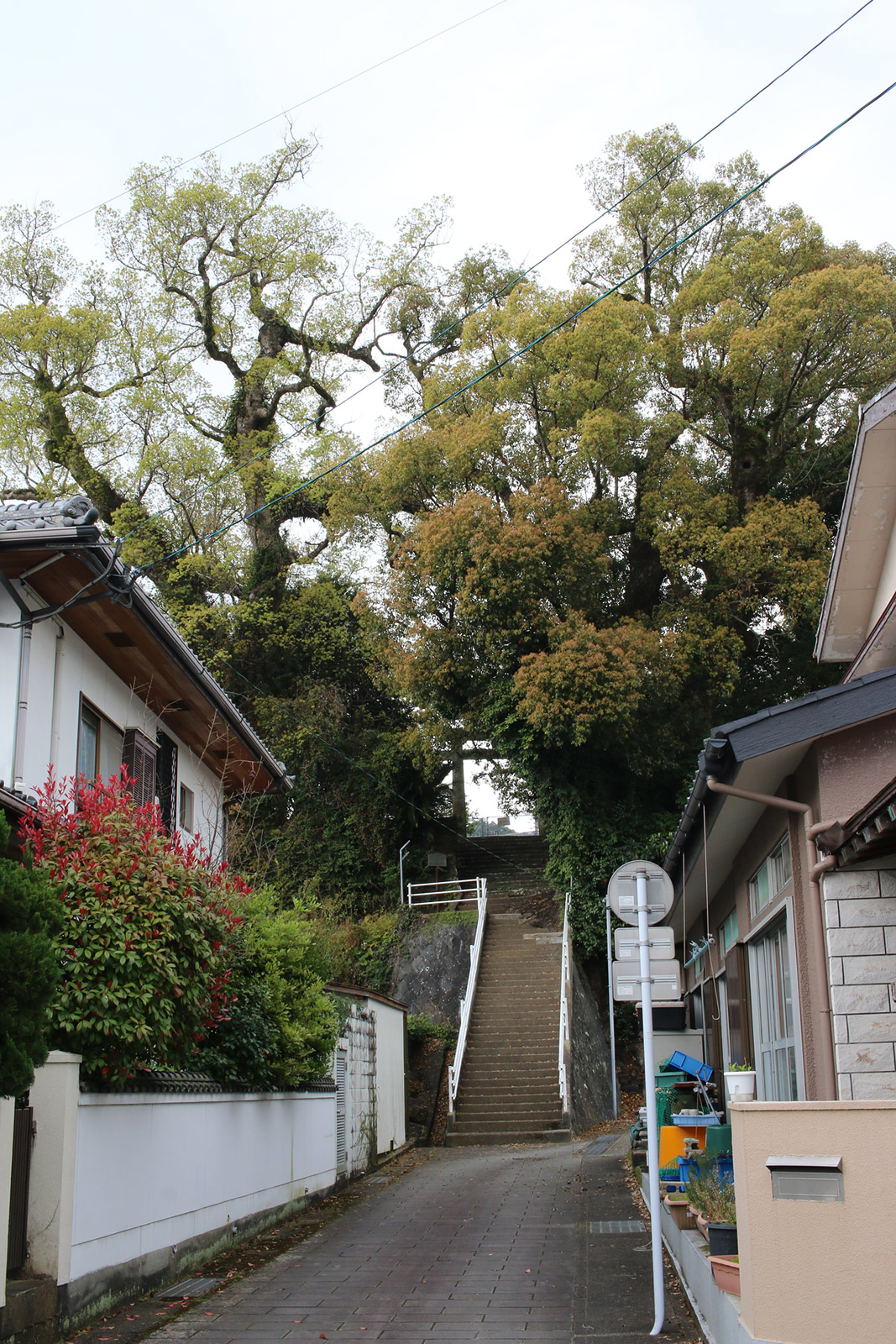 とても大きな二本の大クスが目立ちますが、その真ん中に鳥居が立っています。五枚目の写真の大クスが北側、六枚目の写真の大クスが南側の木です。