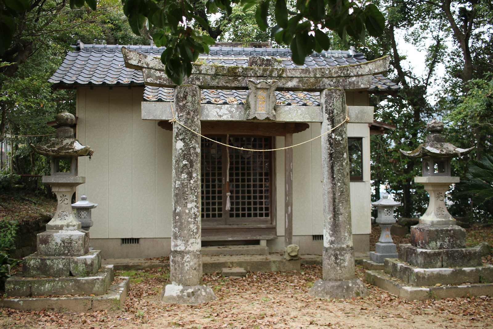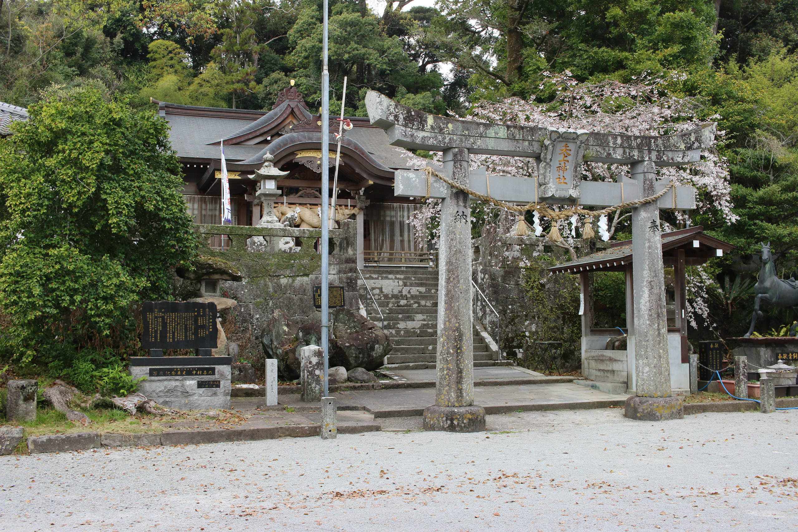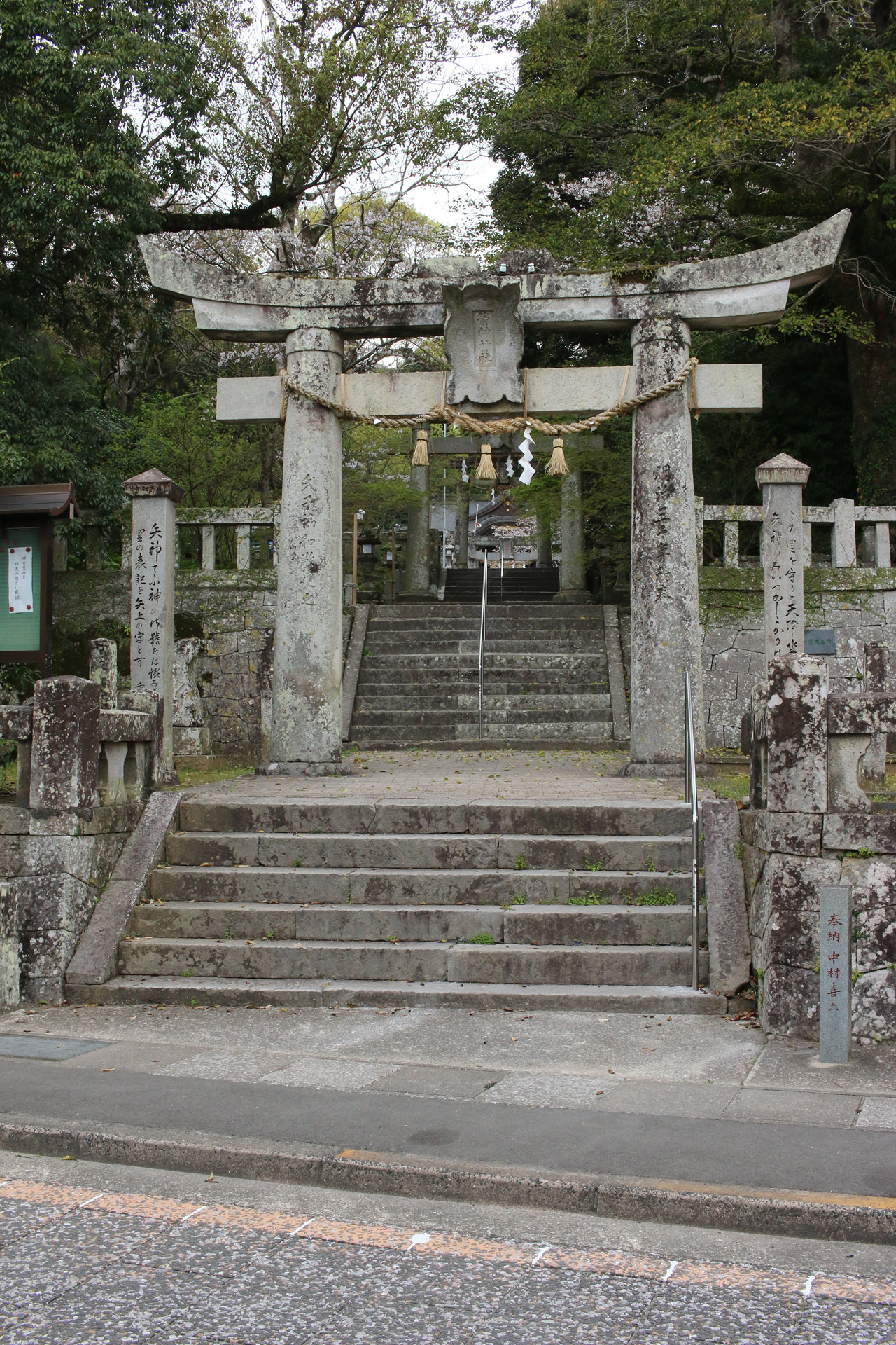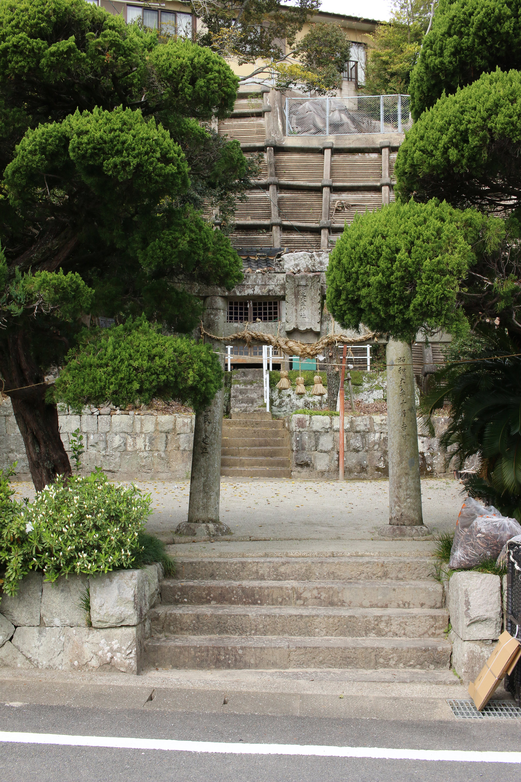 とても大きな二本の大クスが目立ちますが、その真ん中に鳥居が立っています。五枚目の写真の大クスが北側、六枚目の写真の大クスが南側の木です。