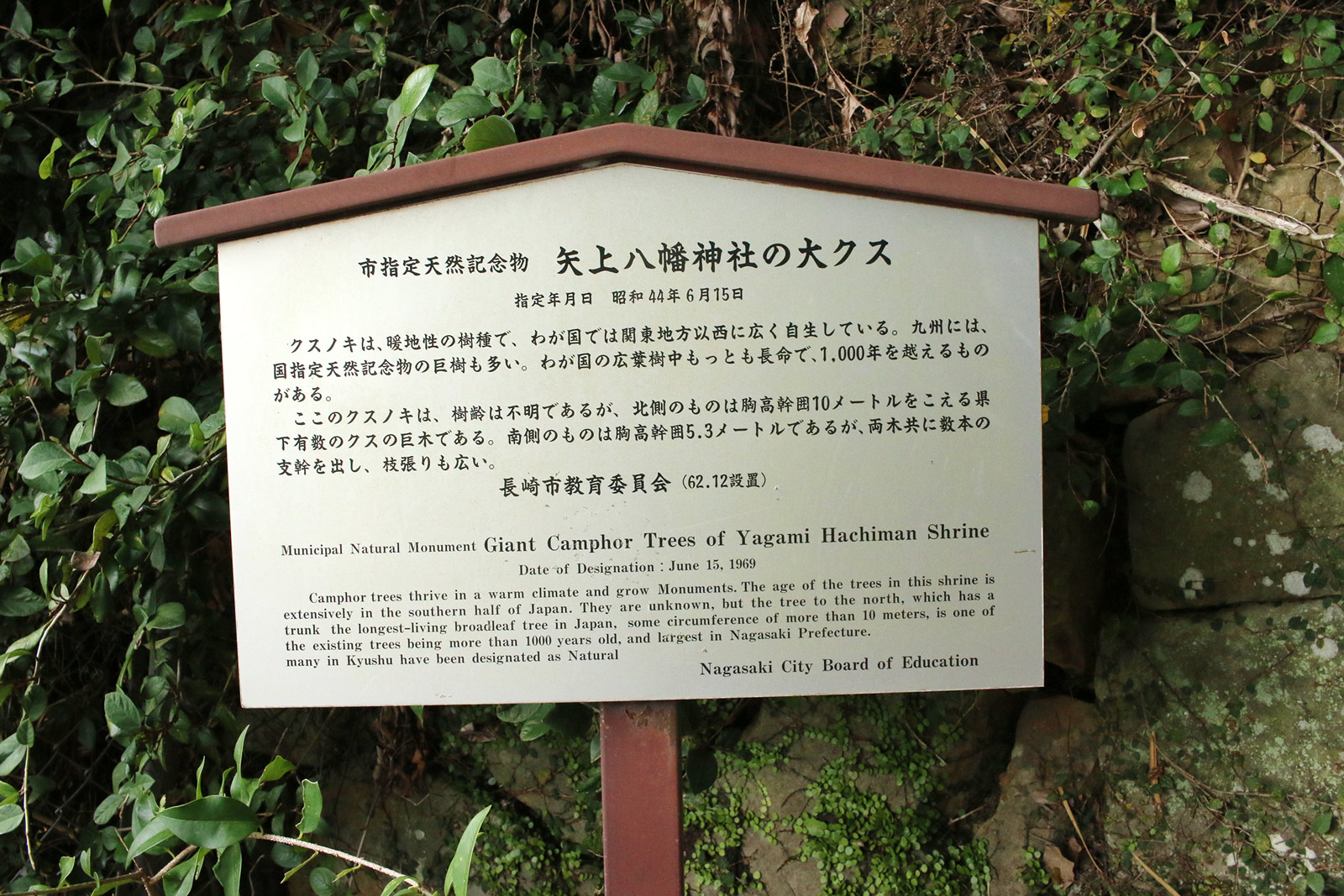 市指定天然記念物 矢上八幡神社の大クス 指定年月日 昭和44年6月15日 クスノキは、暖地性の樹種で、わが国では関東地方以西に広く自生している。九州には、国指定天然記念物の巨樹も多い。わが国の広葉樹中もっとも長命で、1,000年を越えるものがある。ここのクスノキは、樹齢は不明であるが、北側のものは胸高幹囲10メートルをこえる県下有数のクスの巨木である。南側のものは胸高幹囲5.3メートルであるが、両木共に数本の支幹を出し、枝張りも広い。長崎市教育委員会(62.12設置)(案内板より引用)