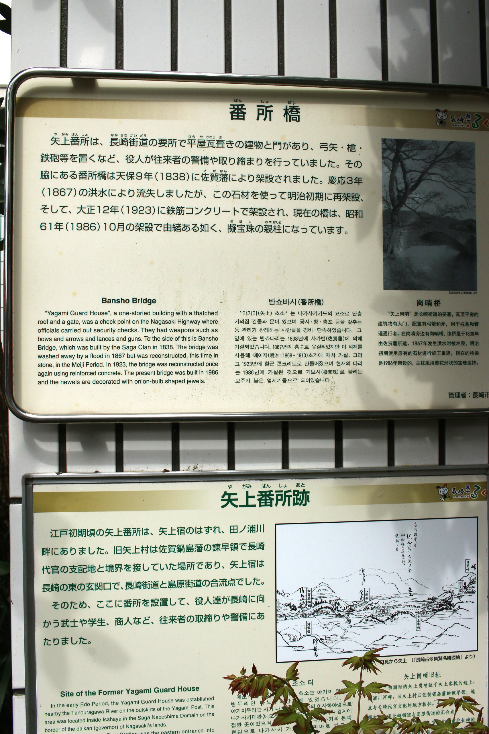 番所橋。矢上番所は、長崎街道の要所で平屋瓦きの建物と門があり、弓矢・槍・鉄砲等を置くなど、役人が往来者の警備や取り締まりを行っていました。その脇にある番所橋は天保9年(1838)に佐賀藩により架設されました。慶応3年(1867)の洪水により流失しましたが、この石材を使って明治初期に再架設、そして、大正12年(1923)に鉄筋コンクリートで架設され、現在の橋は、昭和61年(1986)10月の架設で由緒ある如く、擬宝珠の親柱になっています。(案内板より引用)