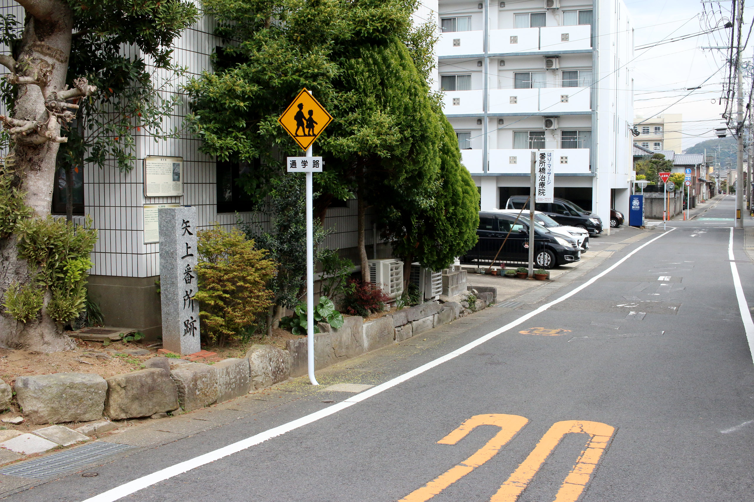 本陣と脇本陣。国道を隔てた現在の長崎自動車学校の所に矢上宿の本陣がありました。佐賀藩内では御茶屋とか上使屋といい、長崎警備のため往来する大名や幕府関係者の宿泊や休憩所でした。広大な敷地に豪壮な建物があって、便所も床付き漆塗りが施されていました。しかしながら、明治はじめごろ民間に払下げ、解体されました。ここ矢上小学校付近には、脇本陣があり、人馬継ぎ所等の宿の施設がありました。(案内板より引用)