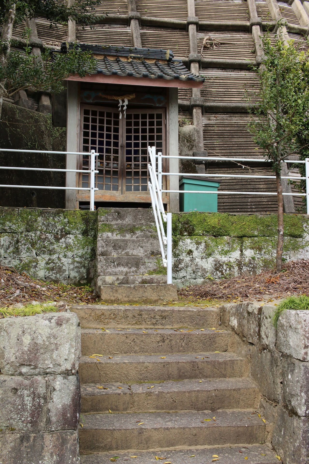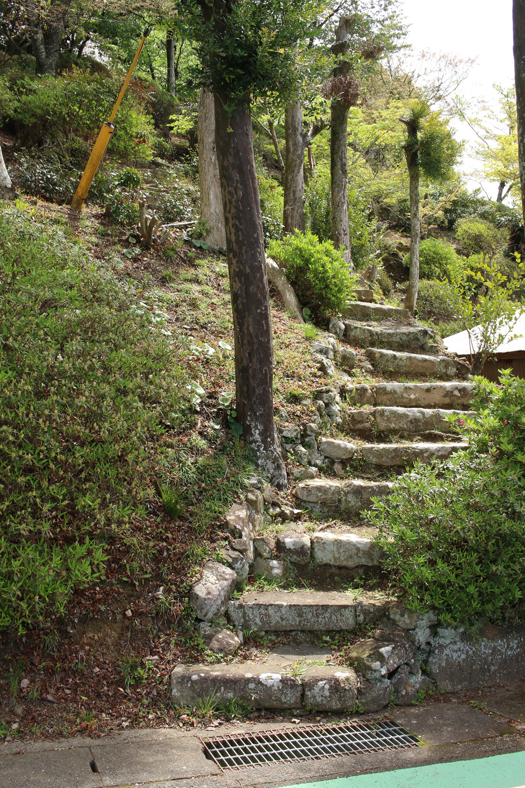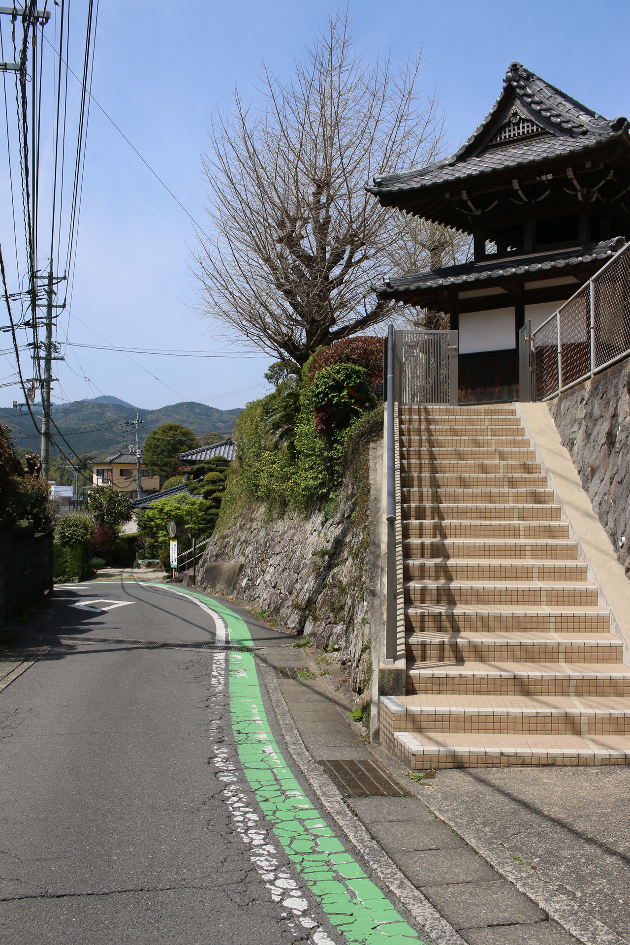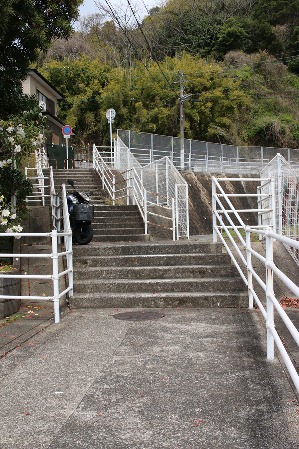 どのおうちも本当に庭木がキレイです。庭園のような空間・階段を発見。とてもオシャレです。そして、前方に赤い頭巾を着たお地蔵さんが見えてきました。