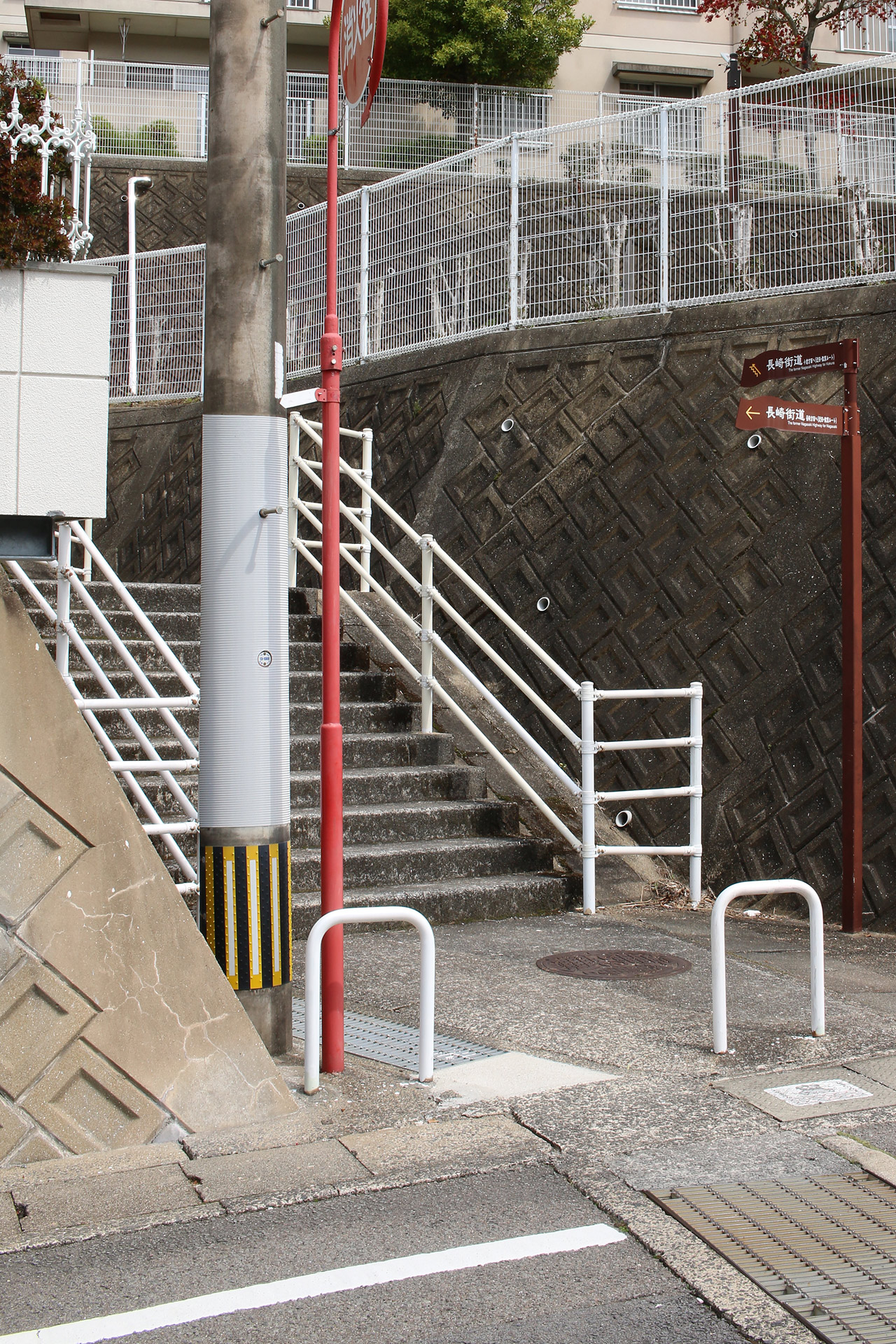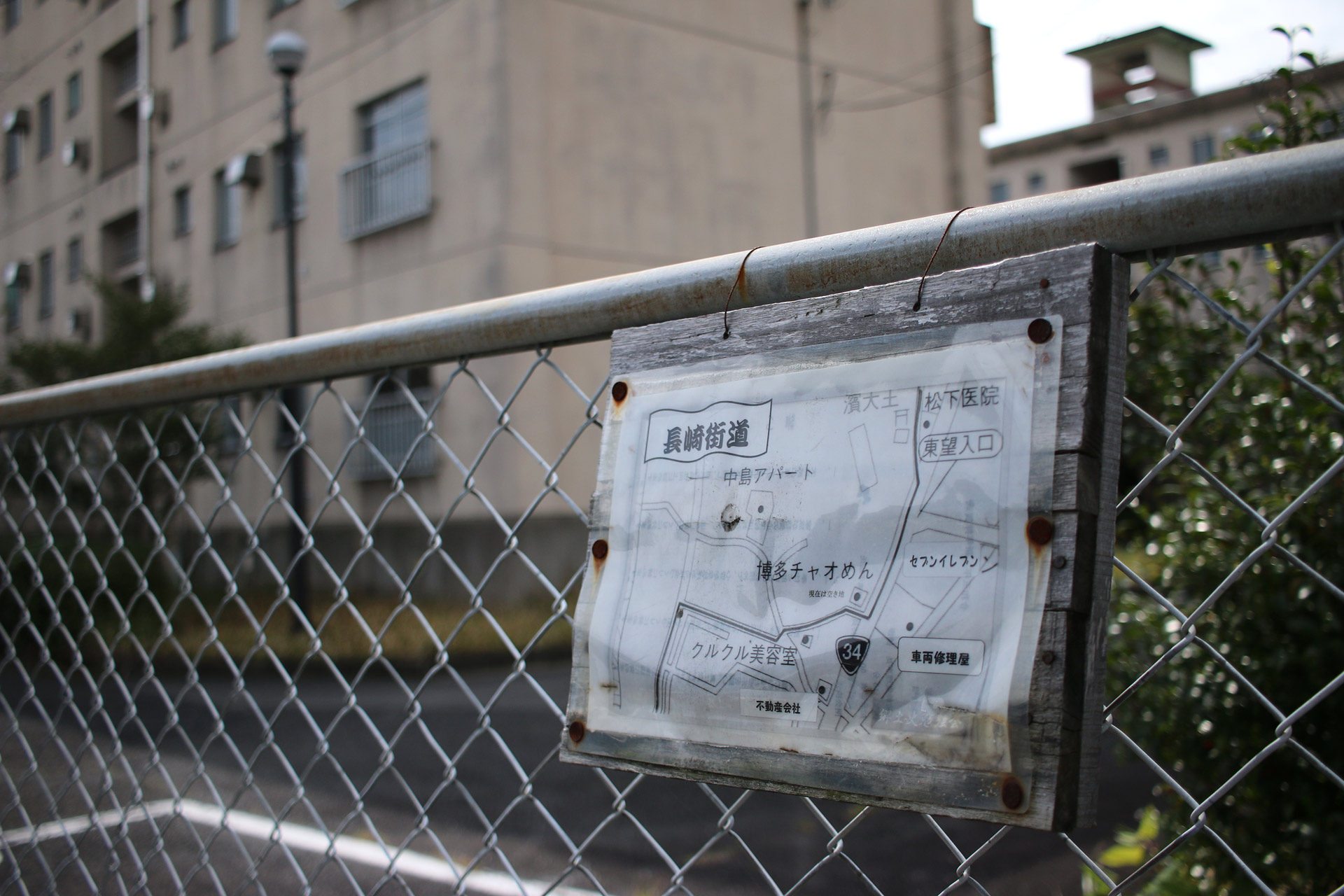 少し進むと、アパート(合同宿舎東長崎住宅)と道標を発見。さらに少し進むとまた道標を発見。アパートに沿って左折(南方向)しますが、その角のフェンスにも手作りの看板を発見。