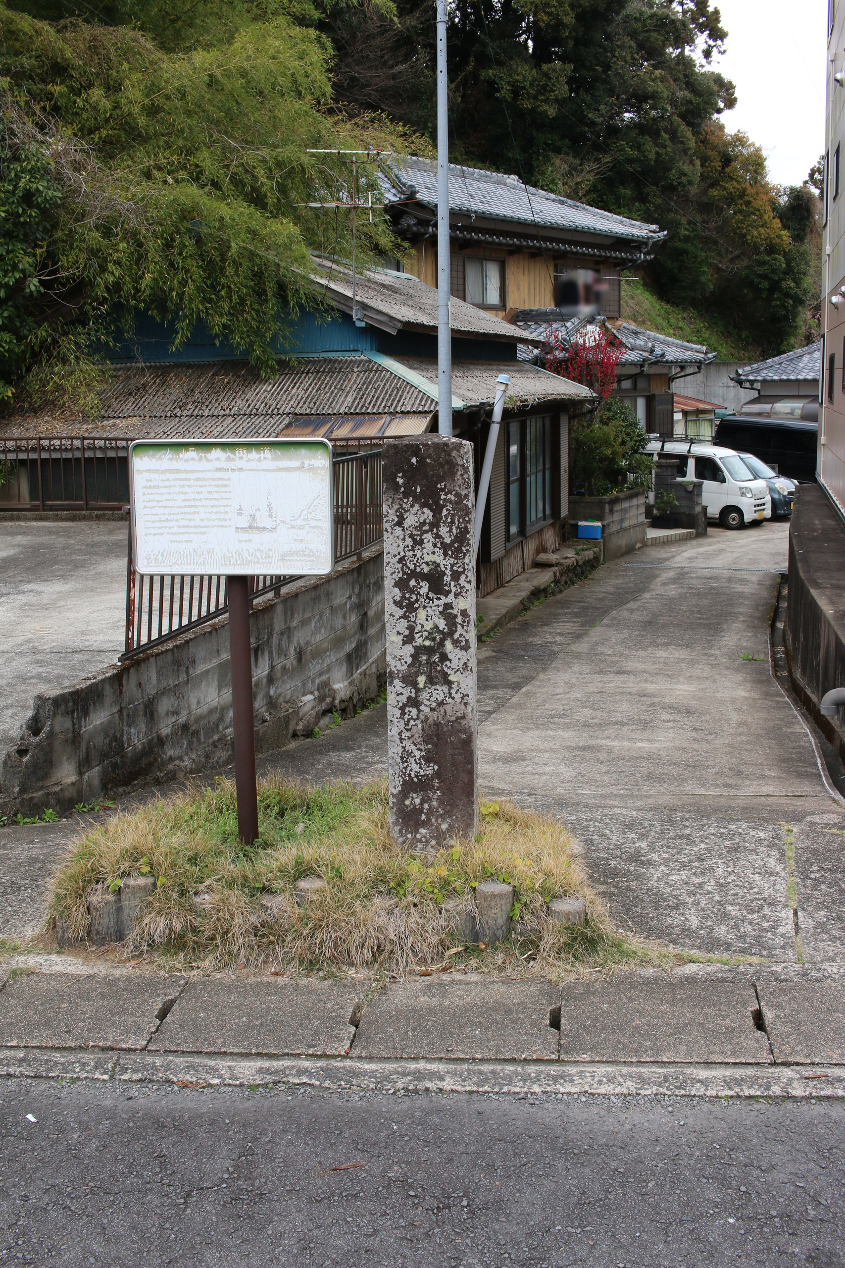 先ほどの分断されている街道は工事中となっていました。ひょっとしたら、順路が整備されているのかもしれません。そして、街道(車道ですが)を進むと道標を発見。ここからほんのいっとき街道(車道)がとても広くなりますが、すぐに細い路地へ入ります。
