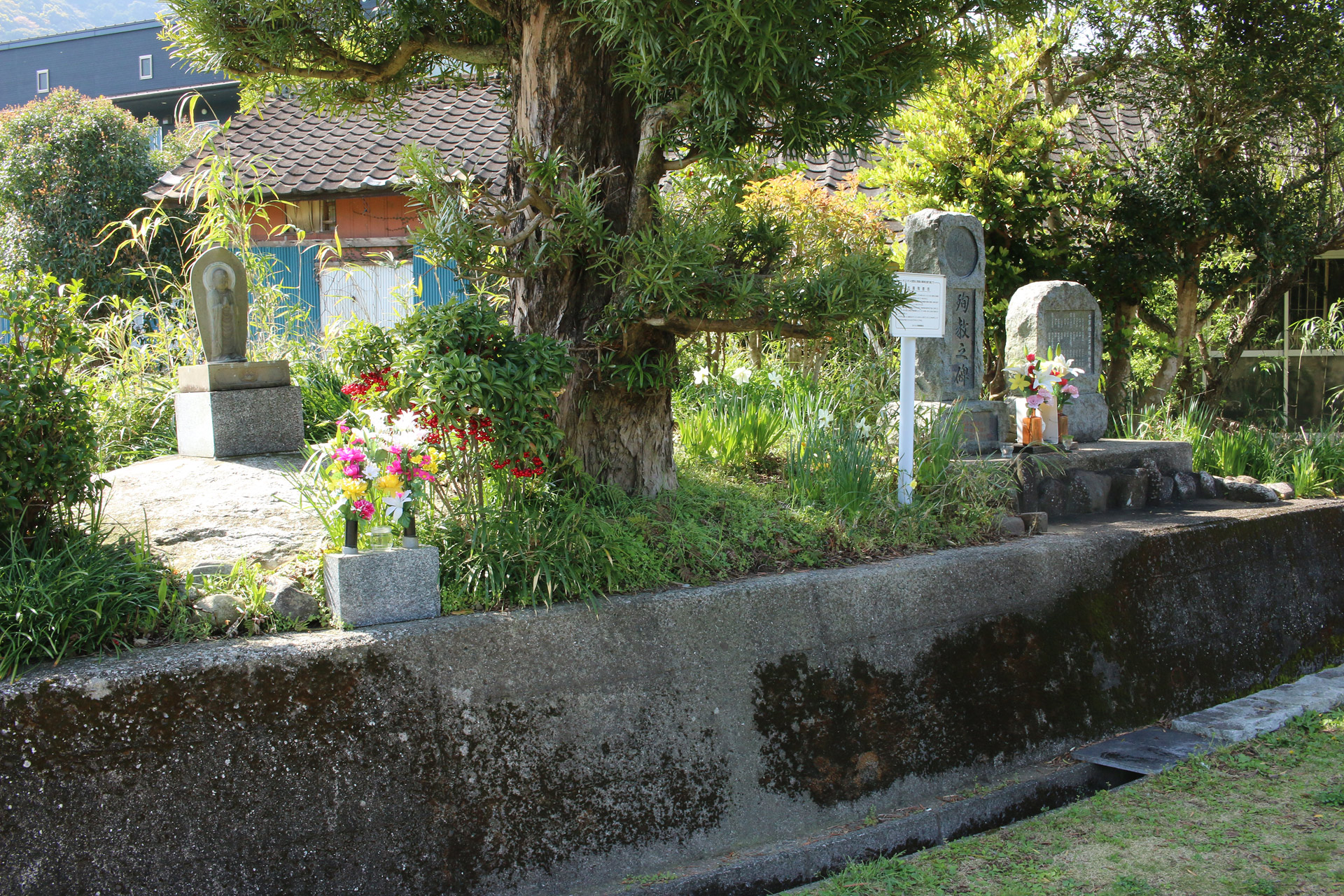 古賀。古賀地区では、キリスト教の伝来以降信仰が盛んになり、ルイス・フロイス著の『日本史』によると、文禄2年(1593)頃には全住民がキリシタンであったとされています。しかし、慶長17年(1612)に出された幕府の禁教令によって、キリシタンへの徹底した弾圧がなされ、この地においてのキリスト教の信仰は歴史の表舞台から姿を消しました。福瑞寺は、この地区のキリシタン撲滅に努めた僧、正哲の功績を賞し、寛永3年(1626)に建立された寺です。境内には花十字紋入りのカマボコ型であるキリシタン墓碑が残されています。この墓碑は被葬者をはじめ、製作者や年代は不明ですが、キリスト教がこの地でも信仰されていたことを物語る貴重な資料といえます。また、この地区は植木の産地として有名です。古賀の植木は、元禄時代(1688~1703)に、同地区の松原名の西山徳右衛門が各地の植木盆栽を研究し、売り出したのが始まりで、六代目の徳兵衛の頃には海外にも輸出されるようになりました。(案内板より引用)