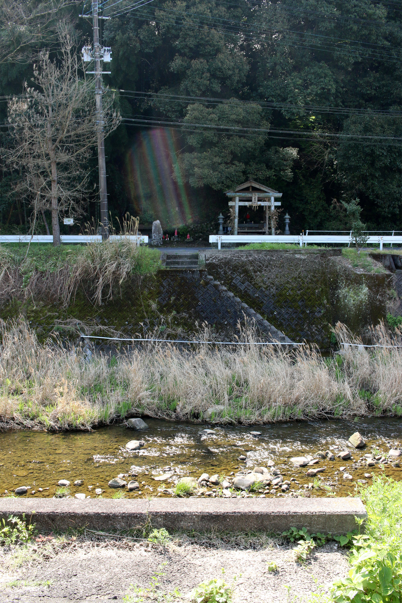一枚目、おそらく三角州の手前あたりを飛び石があったのではないでしょうか。二枚目、しばらく進むと飛び石があります。ちゃんと迂回ルートへ渡れます。(なお、場所はかつてのモノとは違う場所でしょうね)。川向いルートからは役行者神社が見えます。