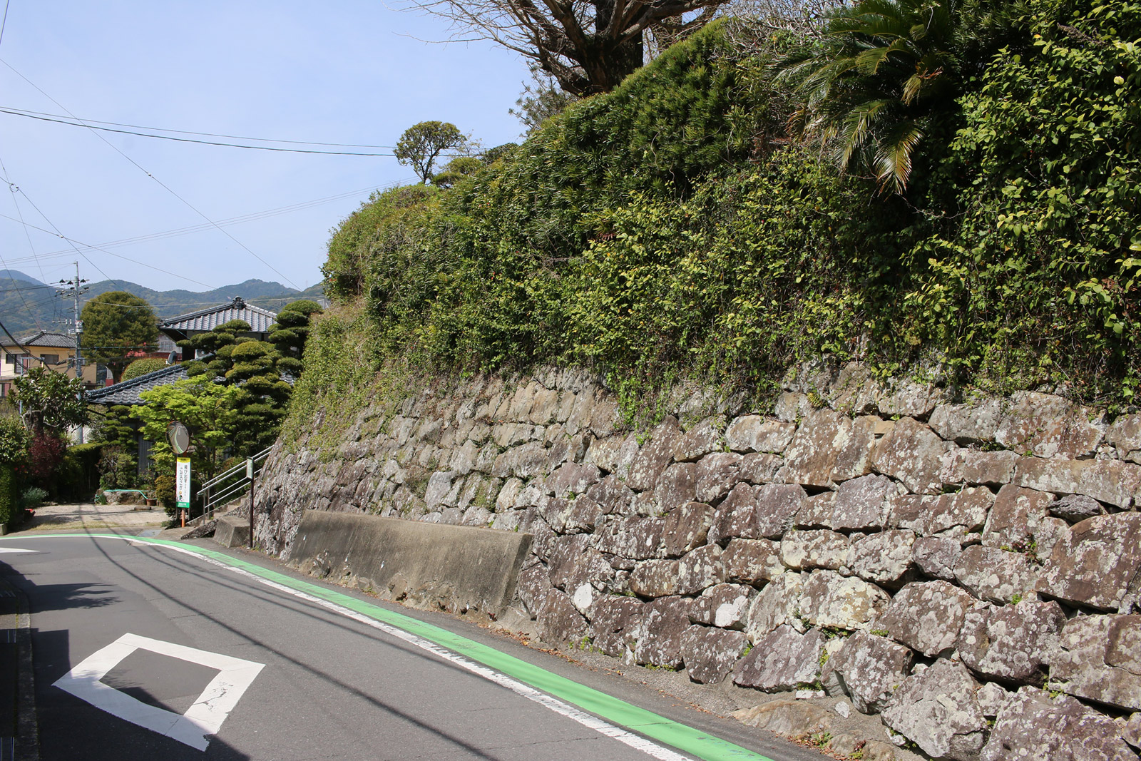 急な坂道が続きますが、振り返るととても良い眺めが望めます。なお、途中に一部だけ石垣が残っていました(写真一枚目)。細い坂道を登りきると石碑と案内板を発見。