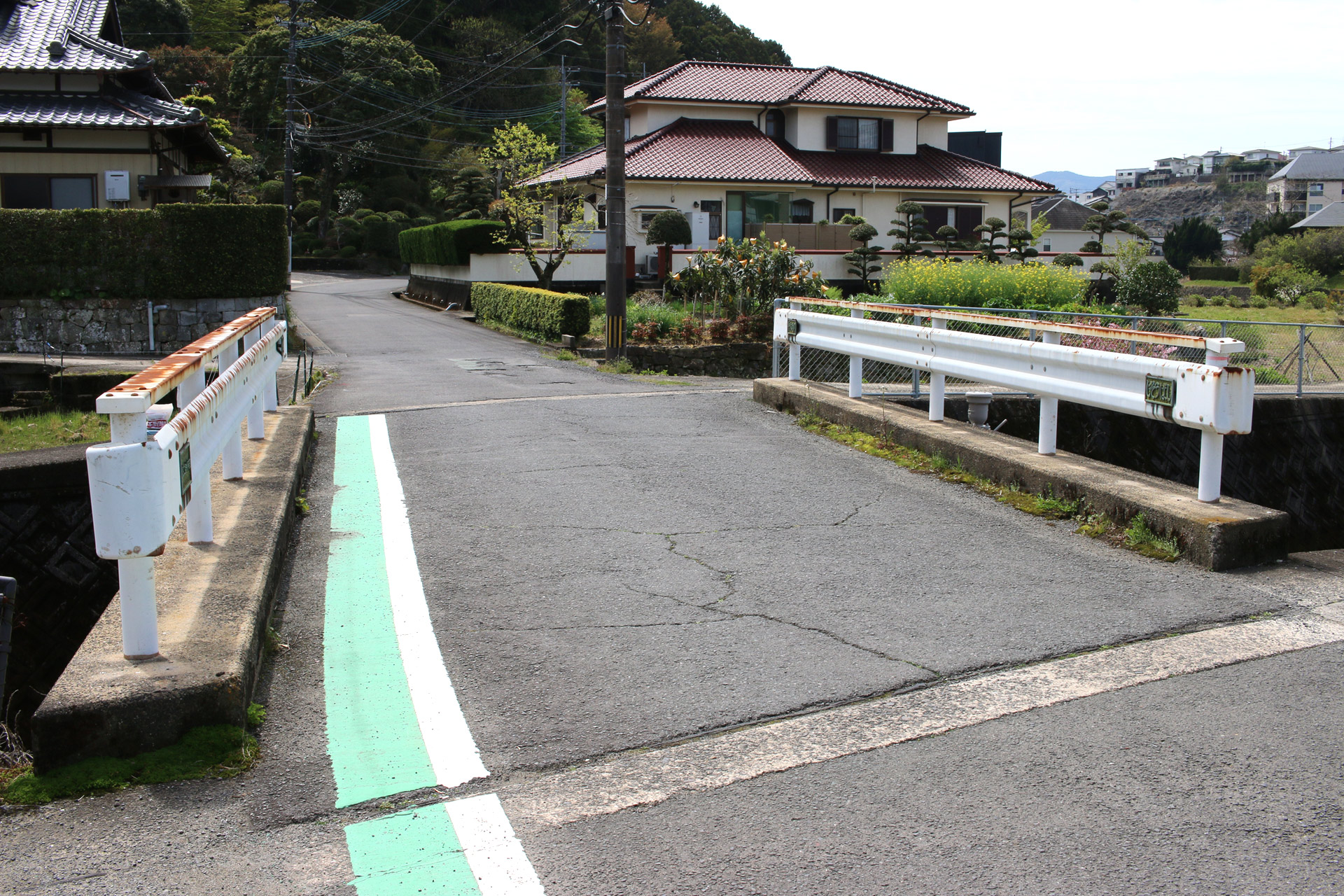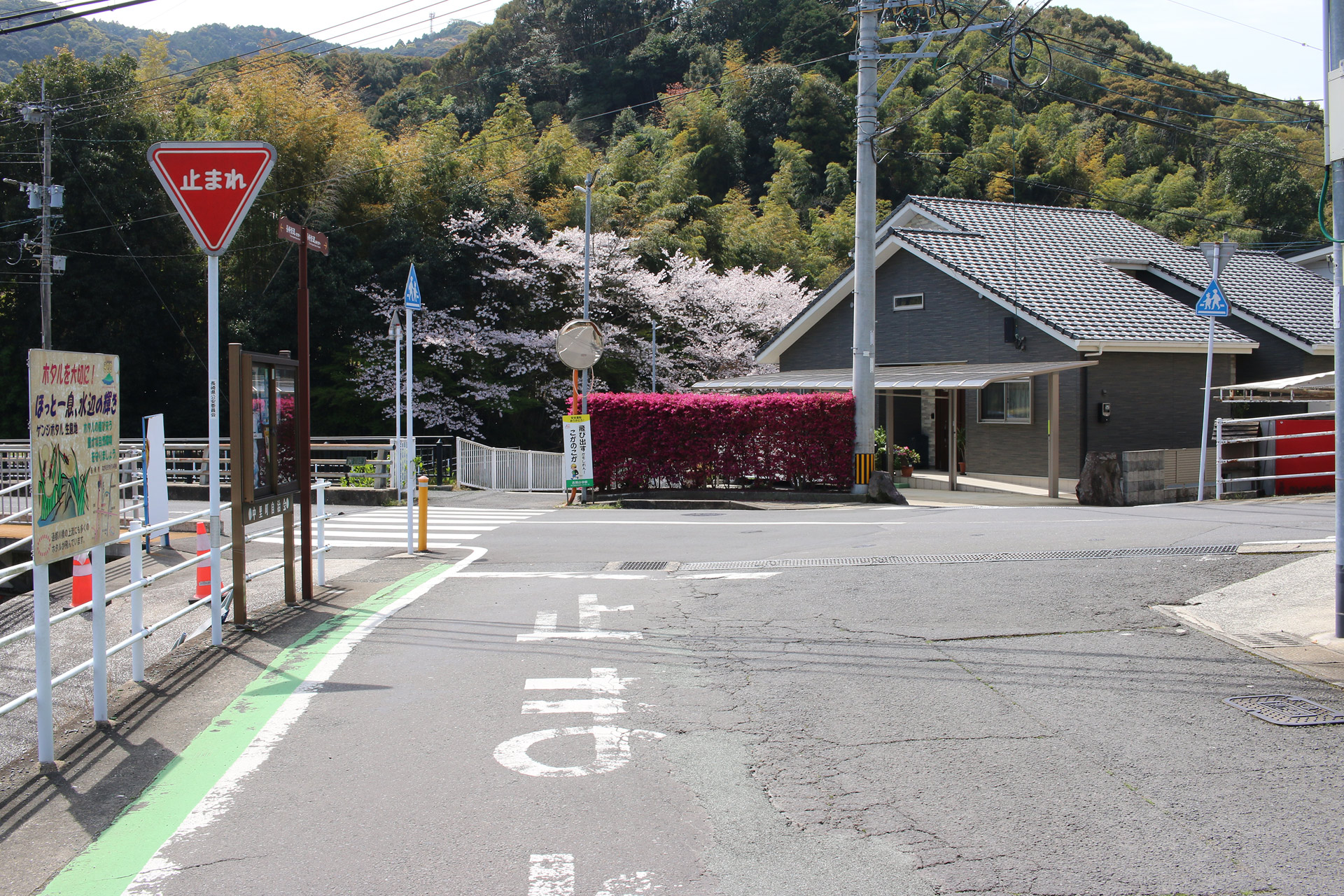 手作り看板から真後ろを向くと、細い路地があり、それが街道です。おもむきのある民家をとおりすぎると、街道を国道34号線が横切ります。
