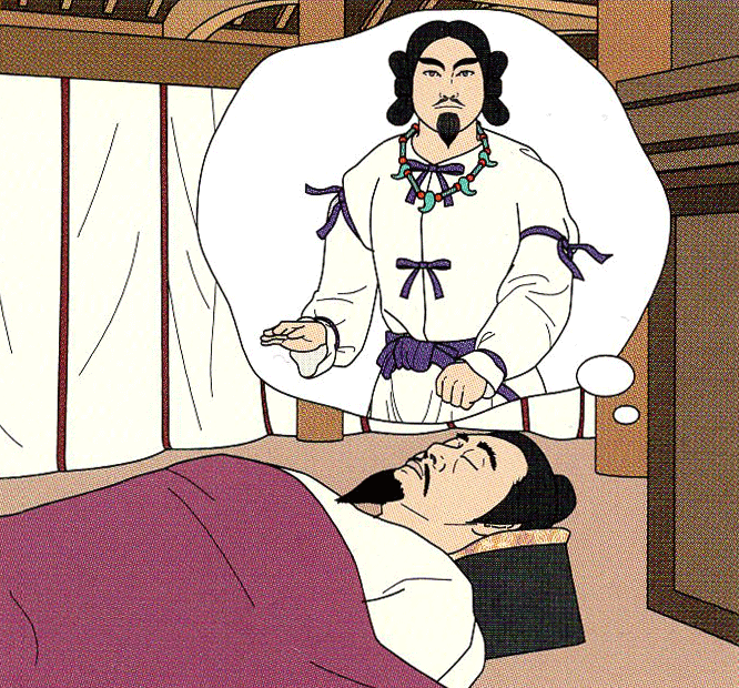 国内に疫病が蔓延していた頃、崇神の夢のなかにオオモノヌシ(三輪山の神)が現れた。神と交流することができる神聖な力を持った天皇であった。