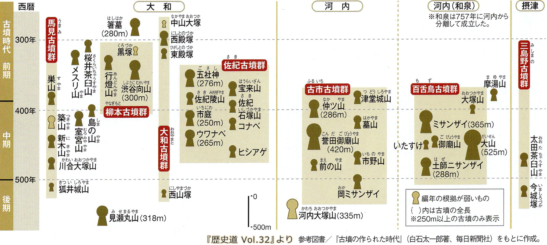 上図は、前方後円墳の規模と築造時期を示す。箸墓古墳ののち、古墳群が大和から西に移動し、河内に古市古墳群、百舌鳥古墳群という巨大古墳群を形成していったことがうかがえる。(『歴史道 Vol.32』より引用)